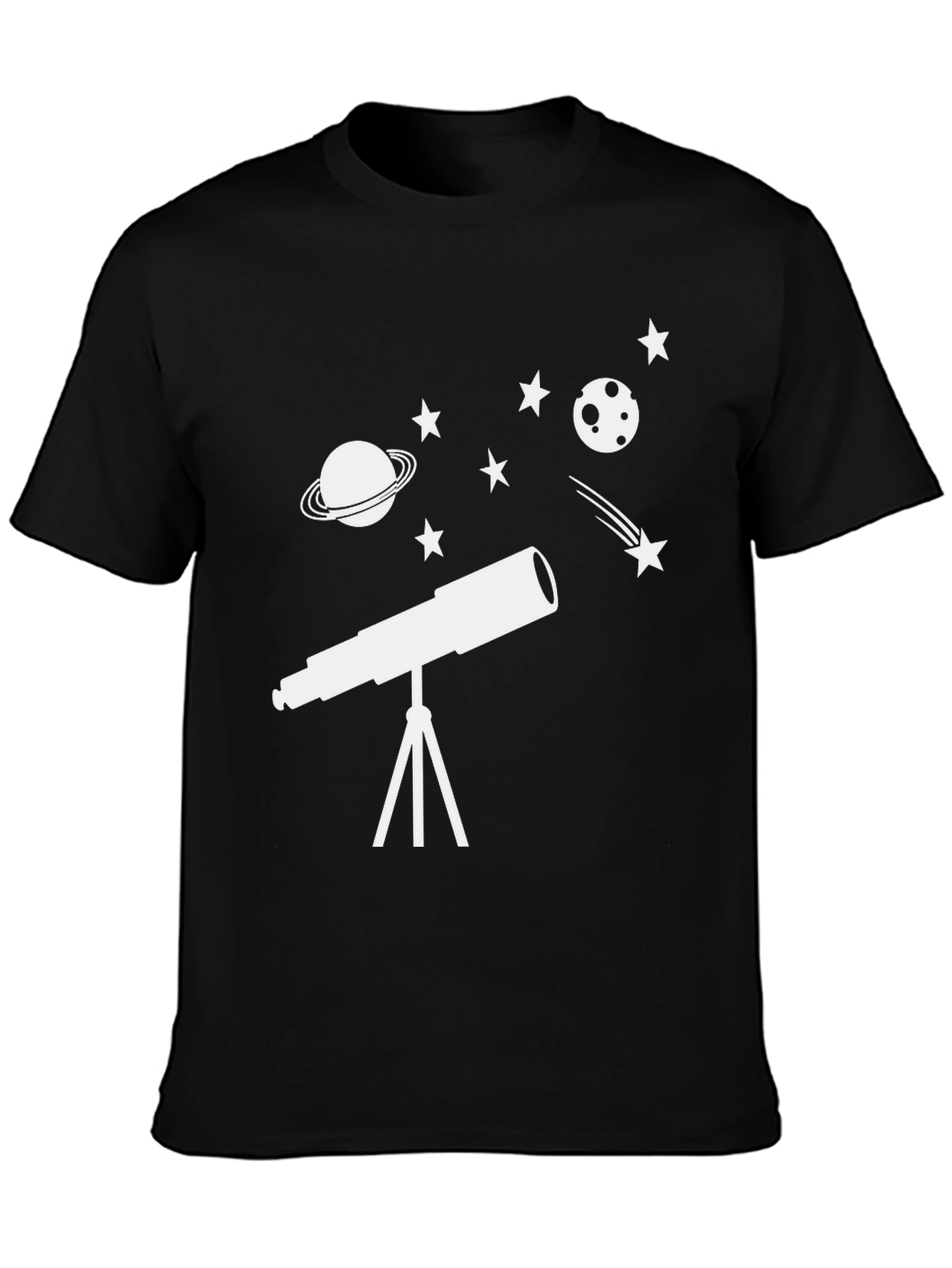 Explore the cosmos in style with this unique astronomy-themed t-shirt. Featuring a clean, white graphic design on a solid black background, this tee showcases a telescope, planet, stars, and a comet. The minimalist aesthetic makes it a versatile piece for casual wear. Made from what appears to be a soft, comfortable fabric, this shirt is perfect for stargazers, science enthusiasts, or anyone who loves a touch of the universe in their wardrobe. Wear it to the science museum, astronomy club meetings, or simply while relaxing at home dreaming of distant galaxies.
