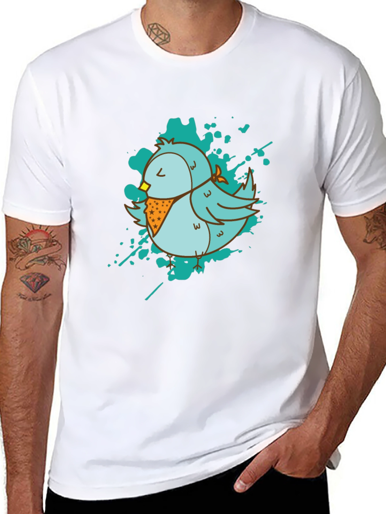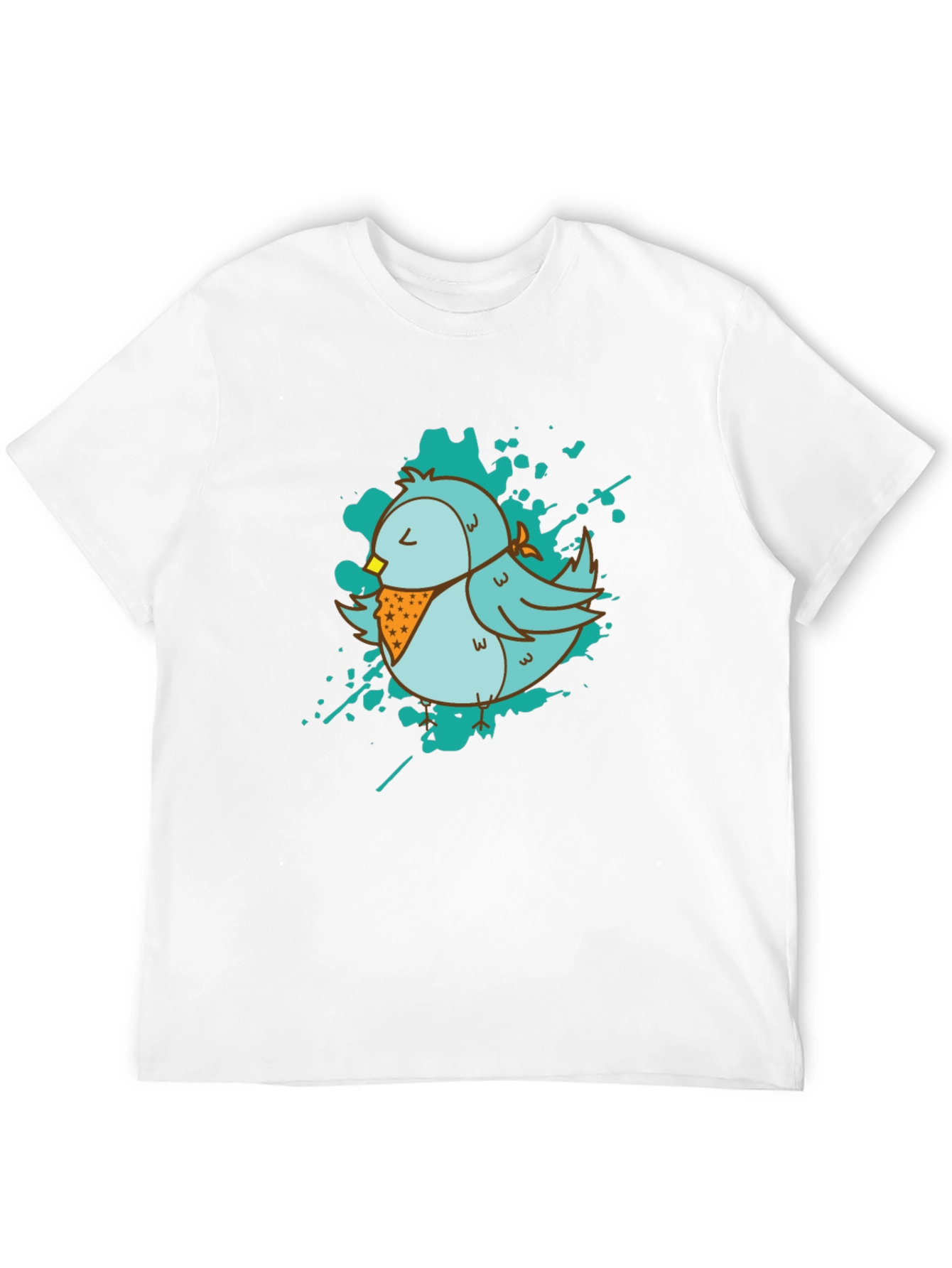 Show off your fun personality with this unique t-shirt! This black tee features a light blue cartoon bird graphic, complete with a patterned bandana and artistic teal splatter background. The t-shirt appears to be made from a comfortable, breathable material, perfect for everyday wear. This eye-catching design is sure to turn heads and spark conversations. Ideal for casual outings, weekend adventures, or simply relaxing at home. Add a touch of whimsy to your wardrobe with this adorable bird graphic tee.