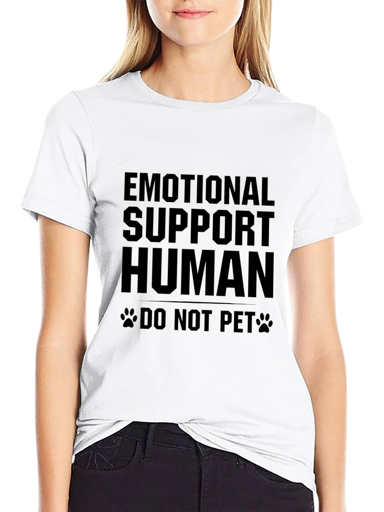 Show off your support with this unique black t-shirt. This tee features a bold "Emotional Support Human" graphic, complete with paw print accents and the cheeky instruction "Do Not Pet." Made from a soft, comfortable fabric, this shirt is perfect for everyday wear. Its relaxed fit ensures all-day comfort, whether you're running errands or lounging at home. This tee is an easy way to express your personality and sense of humor while making a statement. Perfect for animal lovers and anyone who understands the importance of emotional support. A great conversation starter! Wear it with jeans, shorts, or a skirt for a casual and fun look.