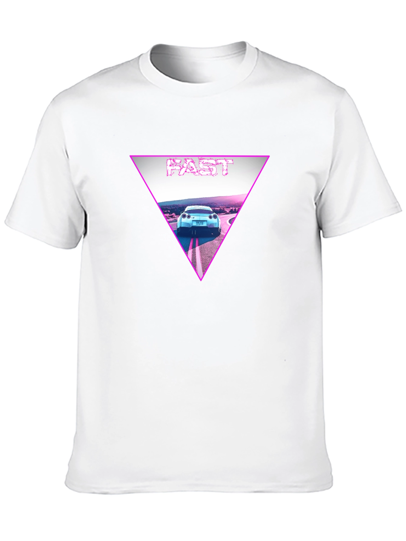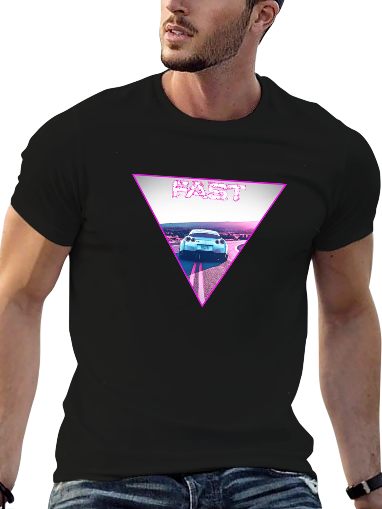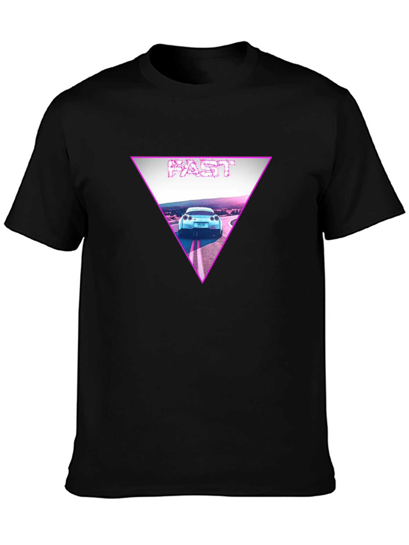 Show off your love for speed with this unique graphic t-shirt. Made from comfortable, breathable fabric, this black t-shirt features a bold triangle design. Inside the triangle, a sleek, modern sports car speeds down a highway at sunset. The word 'FAST' is printed above the car in a cool, neon-style font. Perfect for casual wear, car enthusiasts, or anyone who appreciates eye-catching designs, this shirt is sure to turn heads. Pair it with jeans or shorts for a stylish and effortless look. Get yours today and let everyone know you live life in the fast lane!