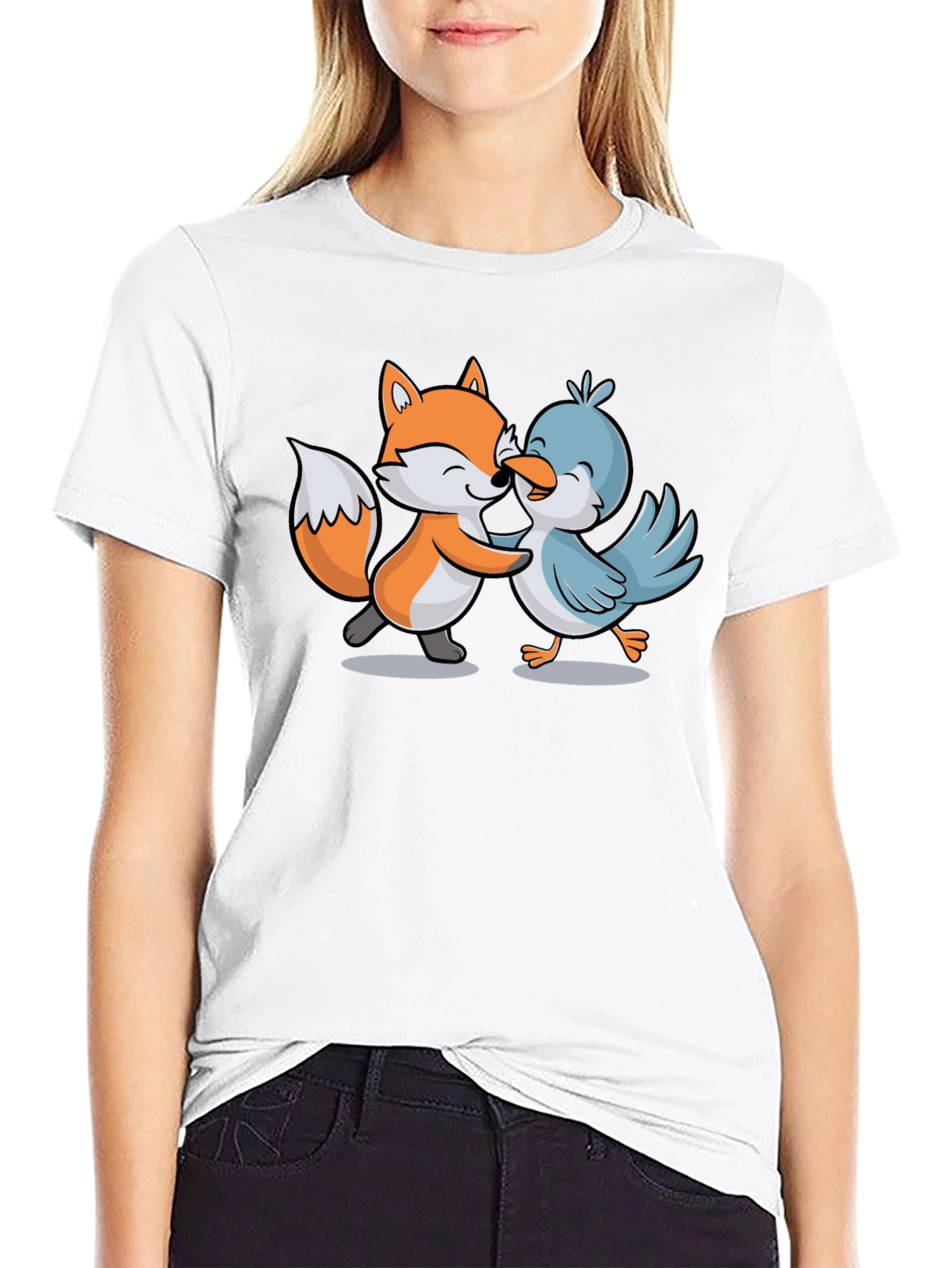 Show off your whimsical side with this adorable black t-shirt featuring a cartoon graphic of a fox and a bird embracing. The charming design is printed on a comfortable-looking tee, perfect for everyday wear. The fox and bird are drawn in a cute, playful style, adding a touch of lightheartedness to your outfit. The tee appears to be made from a soft, breathable material, ensuring comfort and ease of movement. Whether you're running errands or hanging out with friends, this t-shirt is a fun and stylish choice.