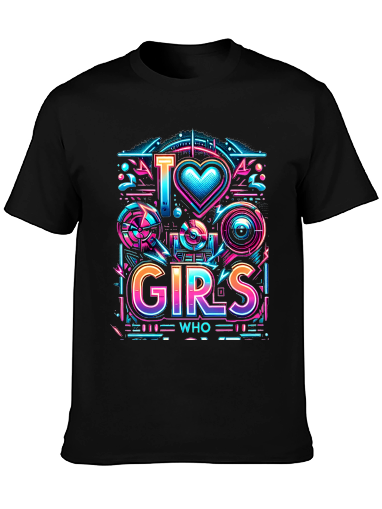 This striking black t-shirt features a vibrant and eye-catching graphic design. The design incorporates the phrase "I <3 GIRLS WHO", rendered in a bold, neon-inspired color palette with a playful, slightly retro aesthetic. The graphic includes a variety of geometric shapes, abstract imagery, and tech-themed elements, hinting at a geeky or tech-savvy interest. Constructed from what appears to be a soft and comfortable cotton blend, this tee is ideal for casual wear, geek events, or expressing your unique personality. Its vibrant colors and statement design make it a standout piece, suitable for those who embrace their individuality and love to make a statement.