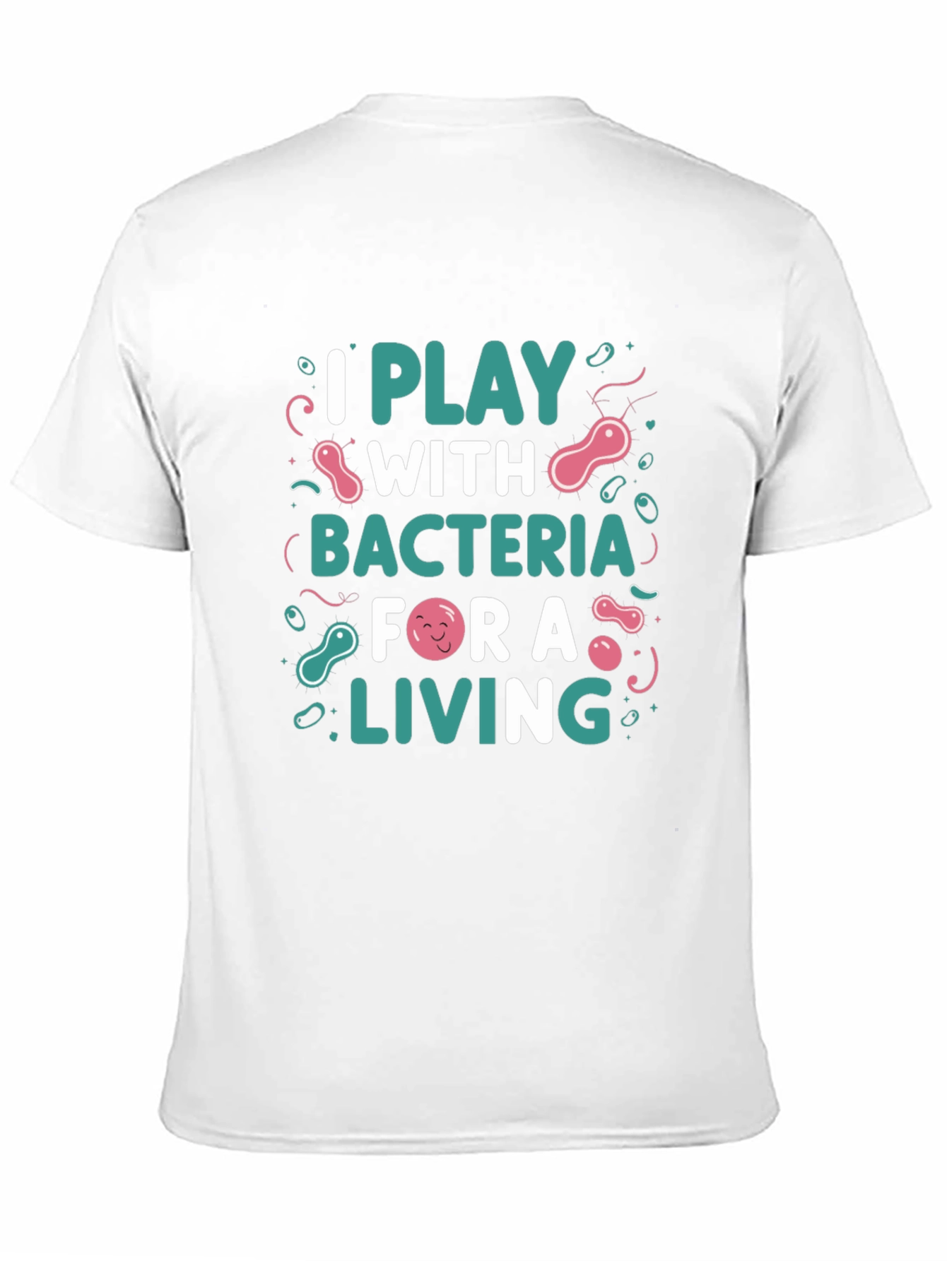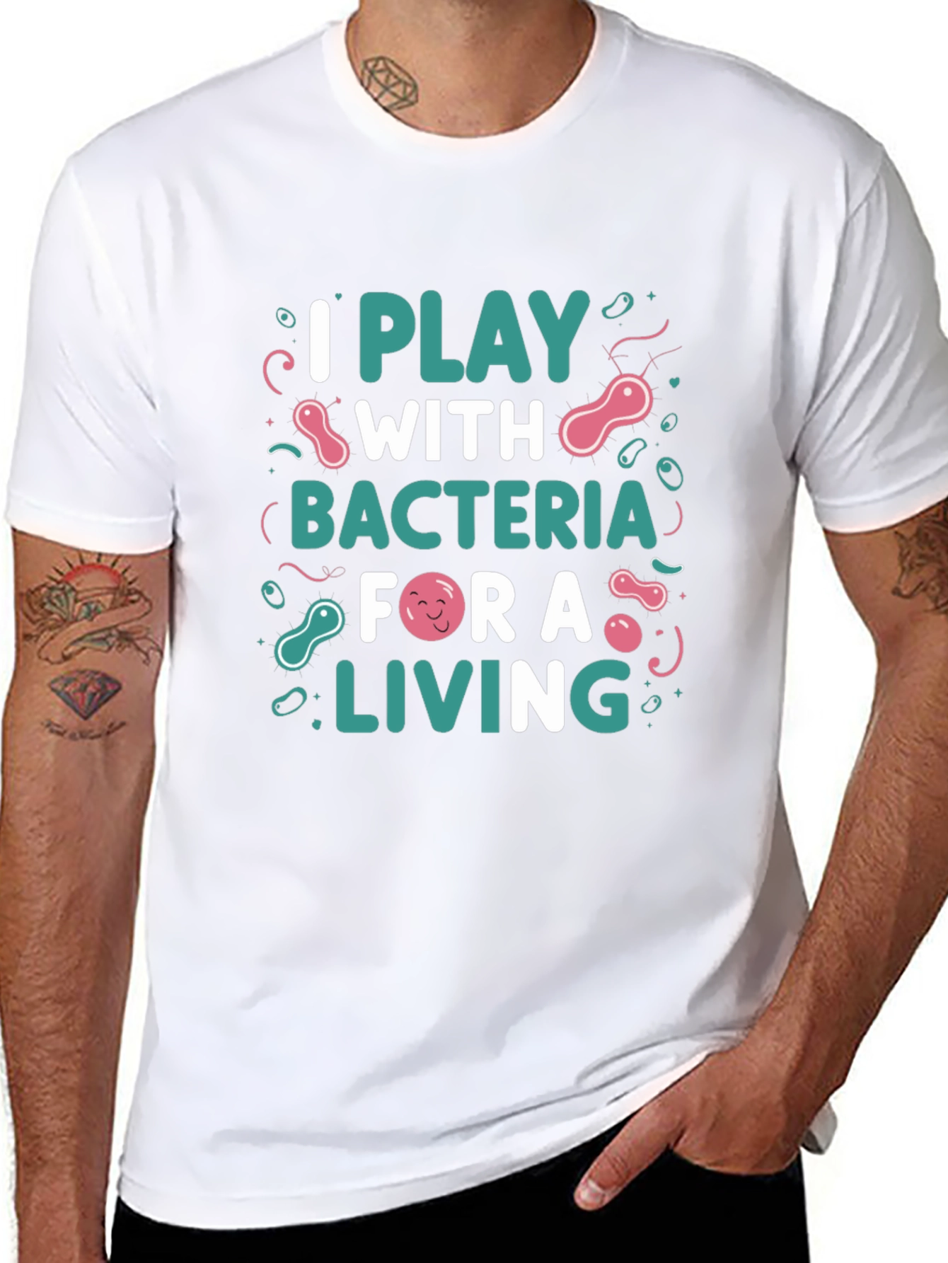 Show off your love for science with this unique "I Play with Bacteria For A Living" T-shirt. The design features playful bacteria graphics in teal and pink, adding a fun twist to the scientific theme. The shirt is made of a comfortable, dark fabric, perfect for casual wear. Ideal for microbiologists, scientists, or anyone with a passion for biology, this tee makes a great conversation starter and a stylish statement piece. Wear it to conferences, labs, or just around town to express your enthusiasm for the microscopic world. Grab yours today and let everyone know what you do for a living!