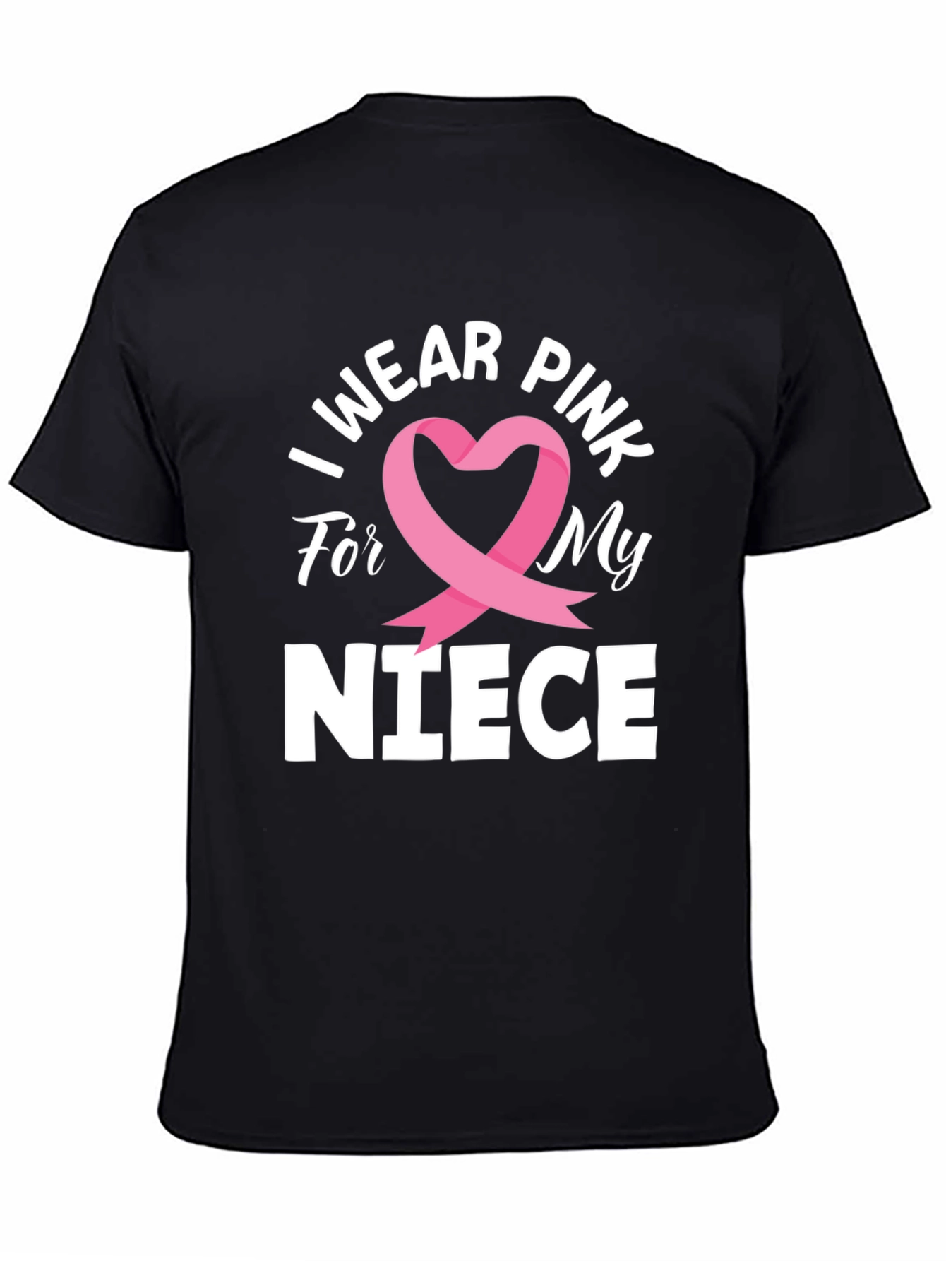 Show your support with this 'I Wear Pink For My Niece' T-shirt. Made from a soft-looking, comfortable fabric, this classic crewneck tee features a bold and eye-catching design. The phrase is prominently displayed in a clear, white font, complemented by a stylish pink ribbon forming a heart shape, symbolizing breast cancer awareness. The shirt is perfect for walks, family gatherings, or any event where you want to show your support. Get yours today and show your support.