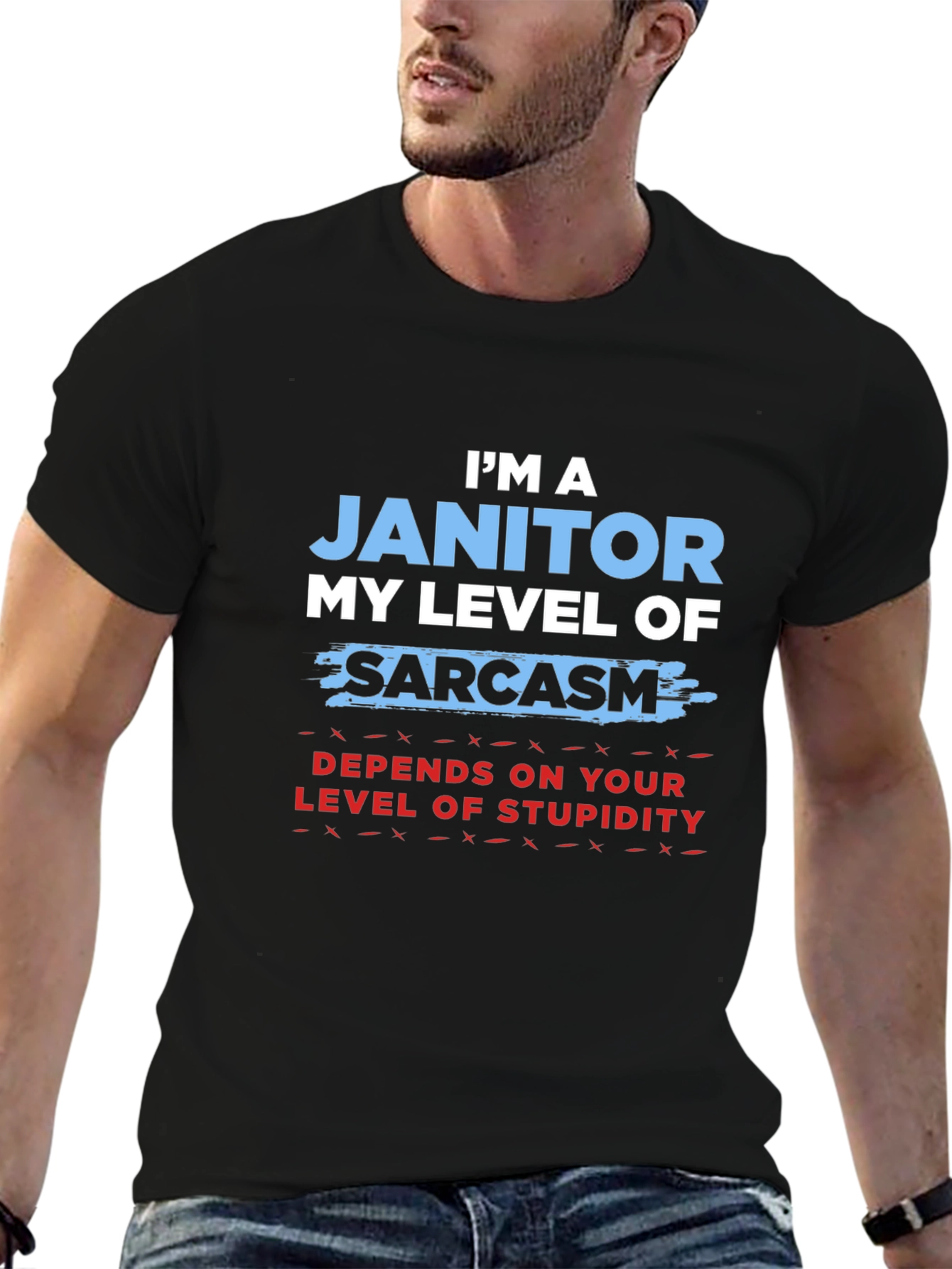 This black t-shirt makes a bold statement! Featuring the funny text, "I'm a Janitor, My level of Sarcasm Depends on your Level of Stupidity," this shirt is sure to get laughs. The text is printed in a mix of blue and red for a stand out design. Made from what appears to be a soft, comfortable cotton blend, this tee is perfect for casual wear. Show off your sense of humor and your janitorial pride with this unique t-shirt. Great for work, weekends, or gag gifts!