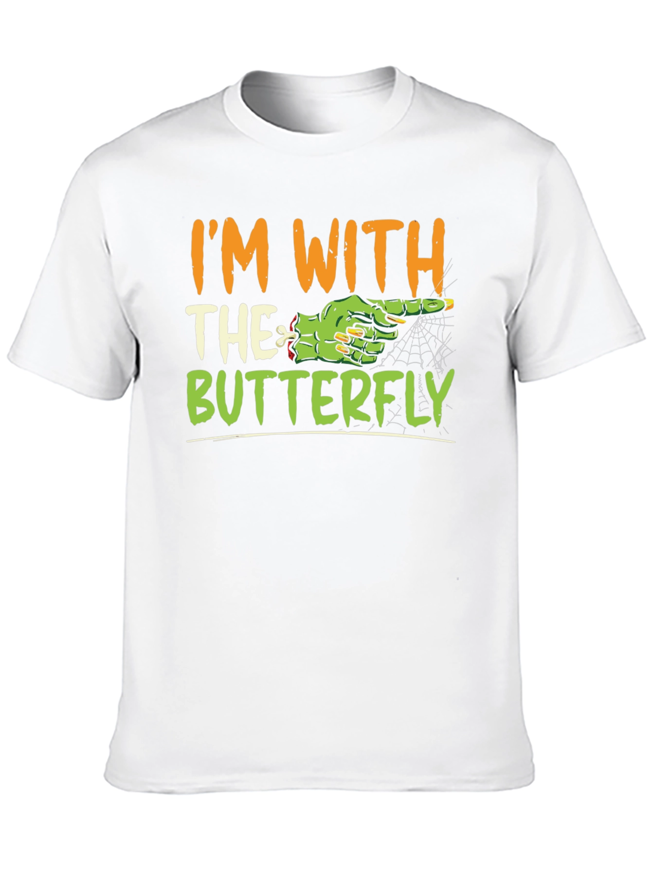 Get ready for Halloween with this unique t-shirt! The design features the humorous phrase "I'm With the Butterfly" in a playful font, complemented by a spooky green zombie hand graphic pointing the way. The print has Halloween colors with orange and green elements. Made from a comfortable, dark-colored fabric, this tee is perfect for casual wear during the spooky season, Halloween parties, or as a fun gift. It's sure to be a conversation starter wherever you go. Show off your Halloween spirit with style and a touch of humor!