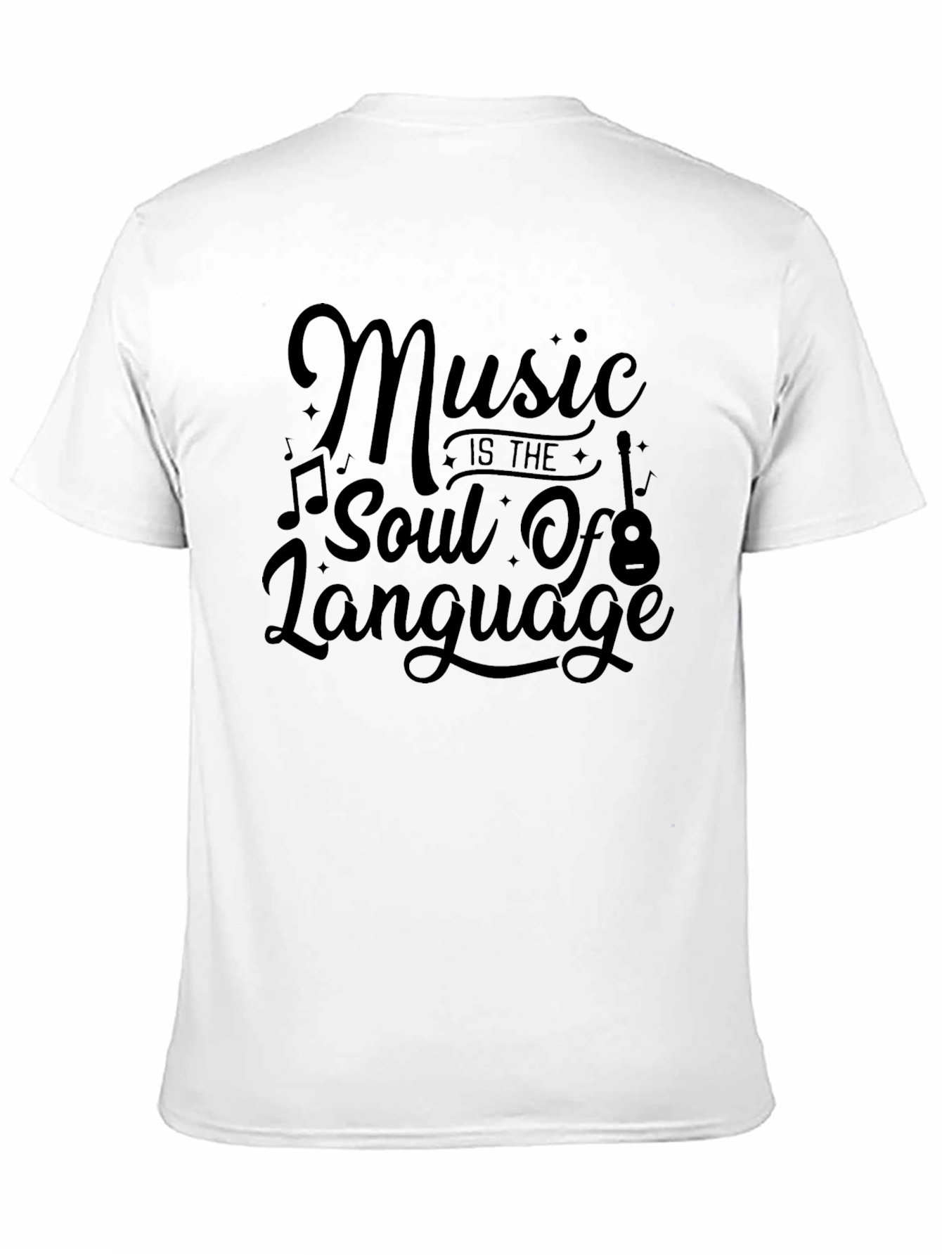 Express your love for music with this stylish black t-shirt. Featuring a bold "Music is the Soul of Language" graphic, this shirt is perfect for musicians, music lovers, and anyone who appreciates the art form. The shirt is made from a soft cotton blend, providing a comfortable and breathable fit. Its classic cut makes it ideal for casual wear, concerts, or simply relaxing at home. The design incorporates musical notes and a guitar illustration. Showcase your passion for music and make a statement with this eye-catching tee. A must-have for any music enthusiast's wardrobe!