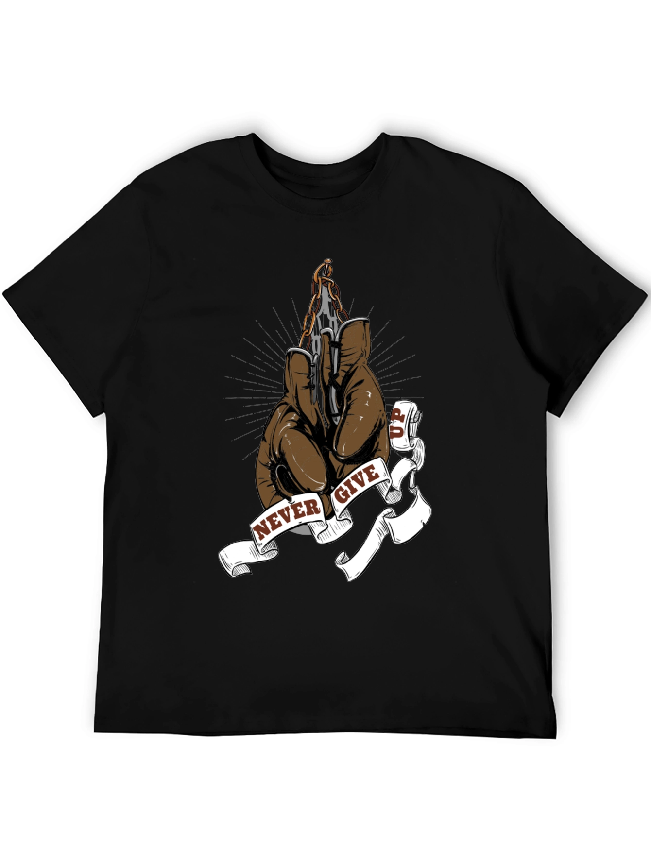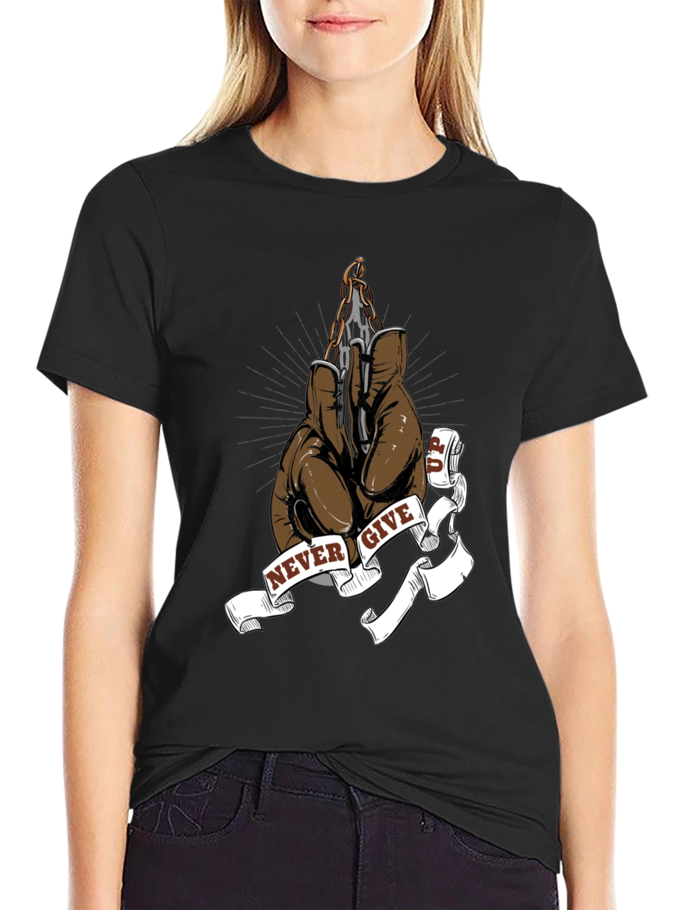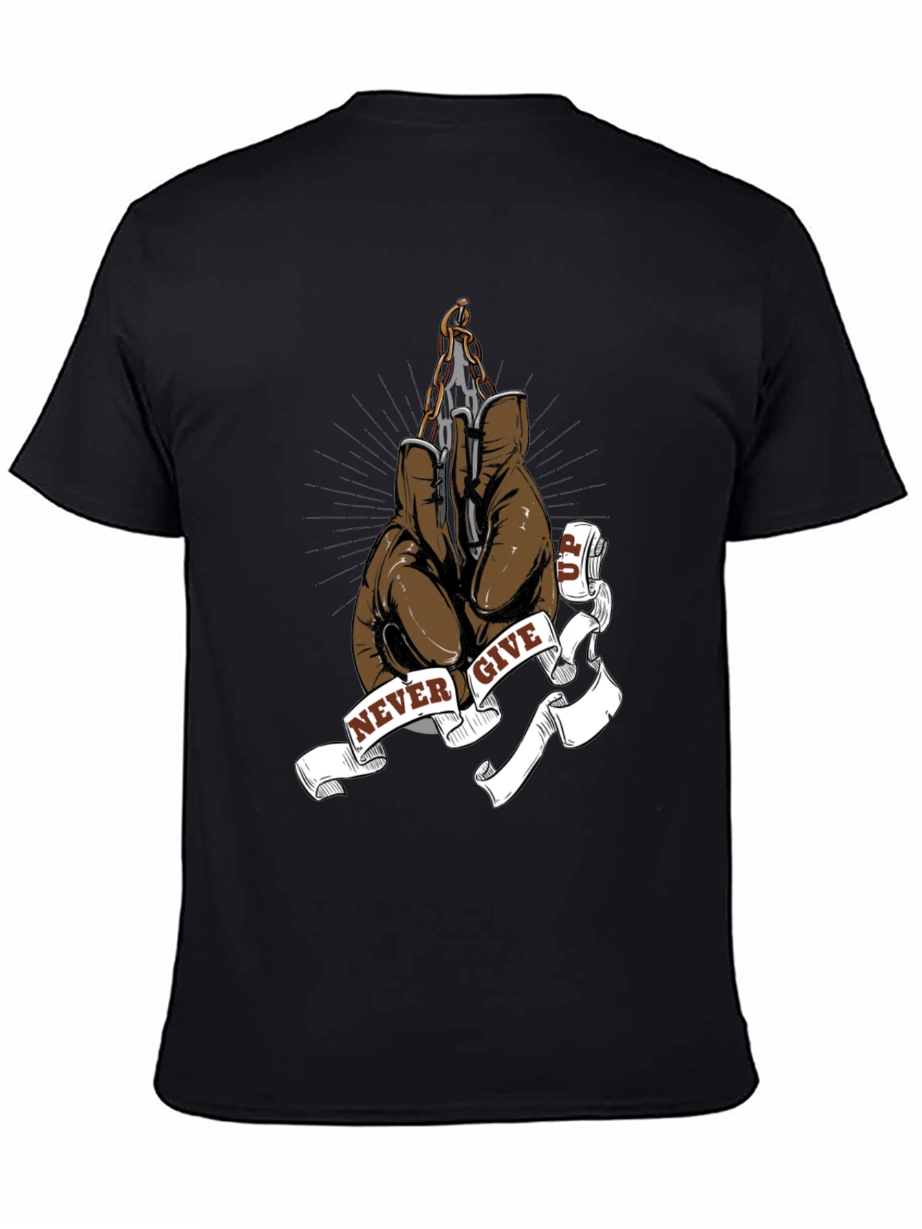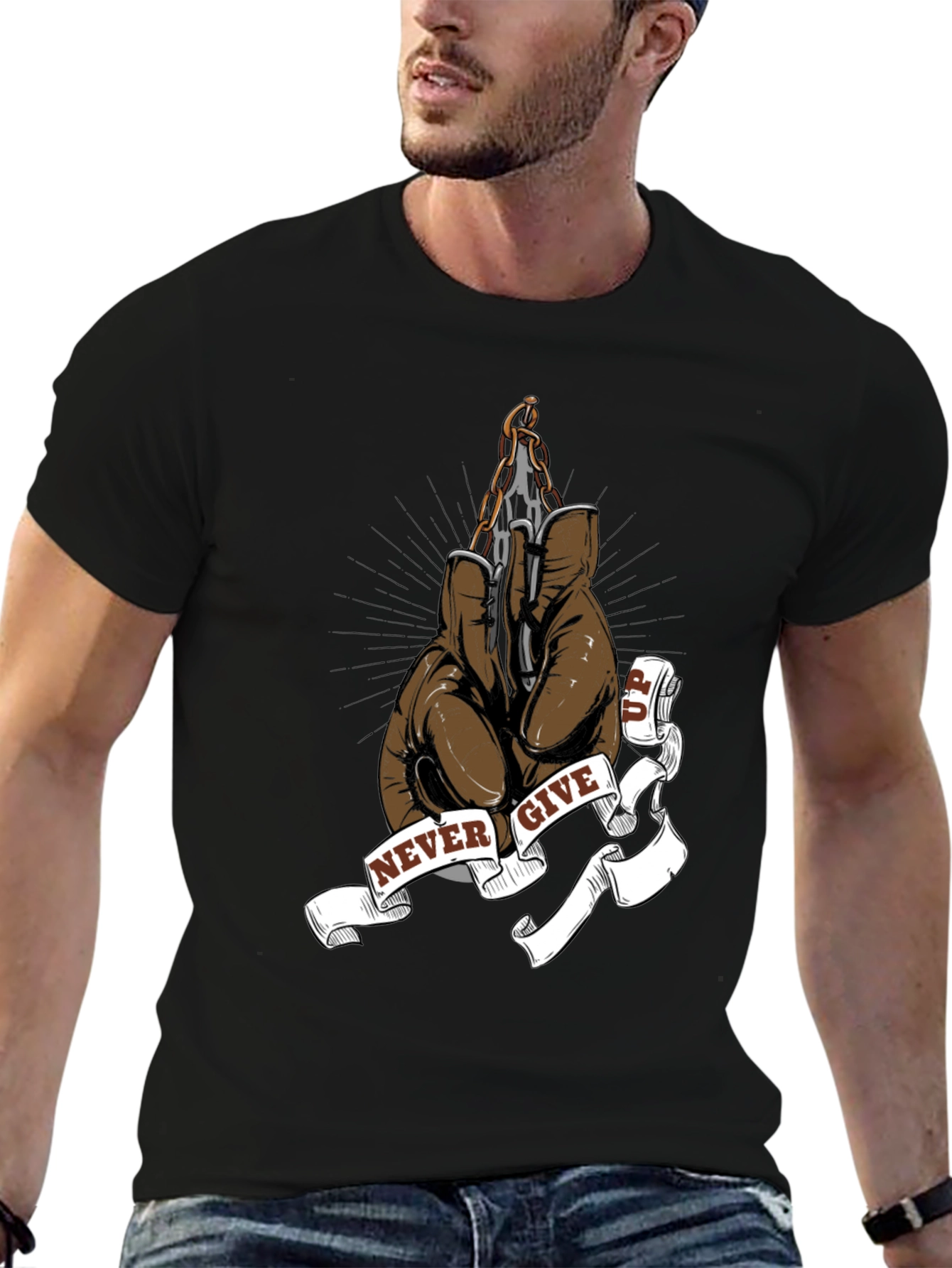 Show your fighting spirit with this bold graphic tee! This black t-shirt features a detailed illustration of vintage-style boxing gloves bound by a chain, with a motivational "Never Give Up" banner. The design is eye-catching and makes a statement. Made from comfortable fabric, it's perfect for everyday wear, workouts, or casual outings. Ideal for boxing enthusiasts or anyone who appreciates inspirational apparel. This tee combines style and motivation, making it a great addition to your wardrobe. Grab yours and keep fighting!