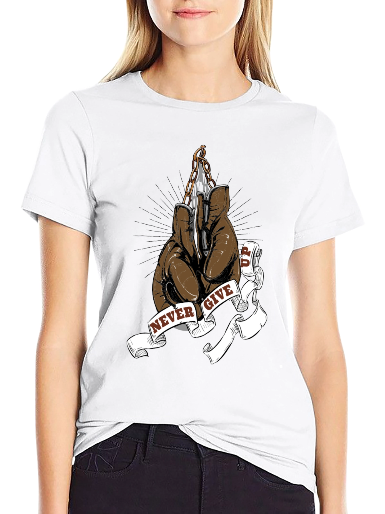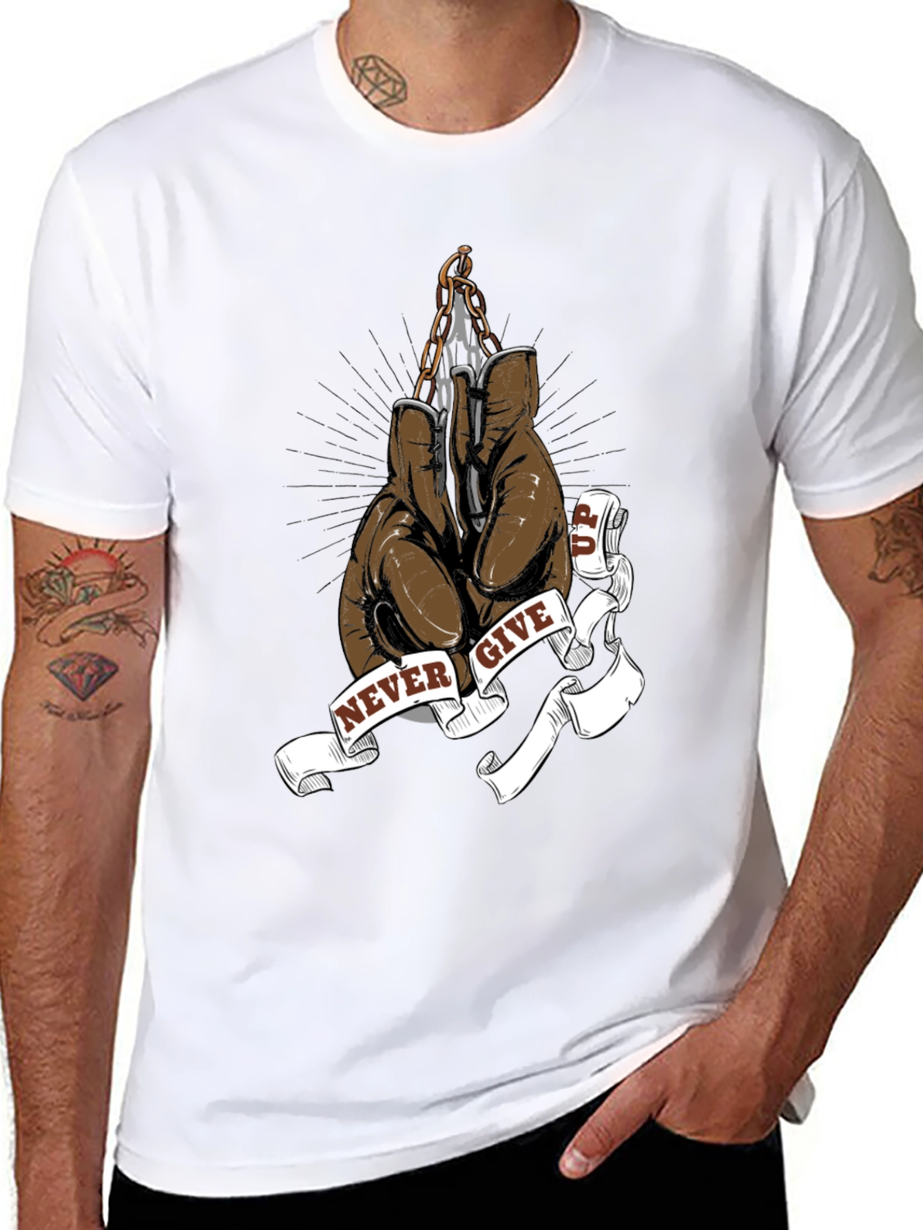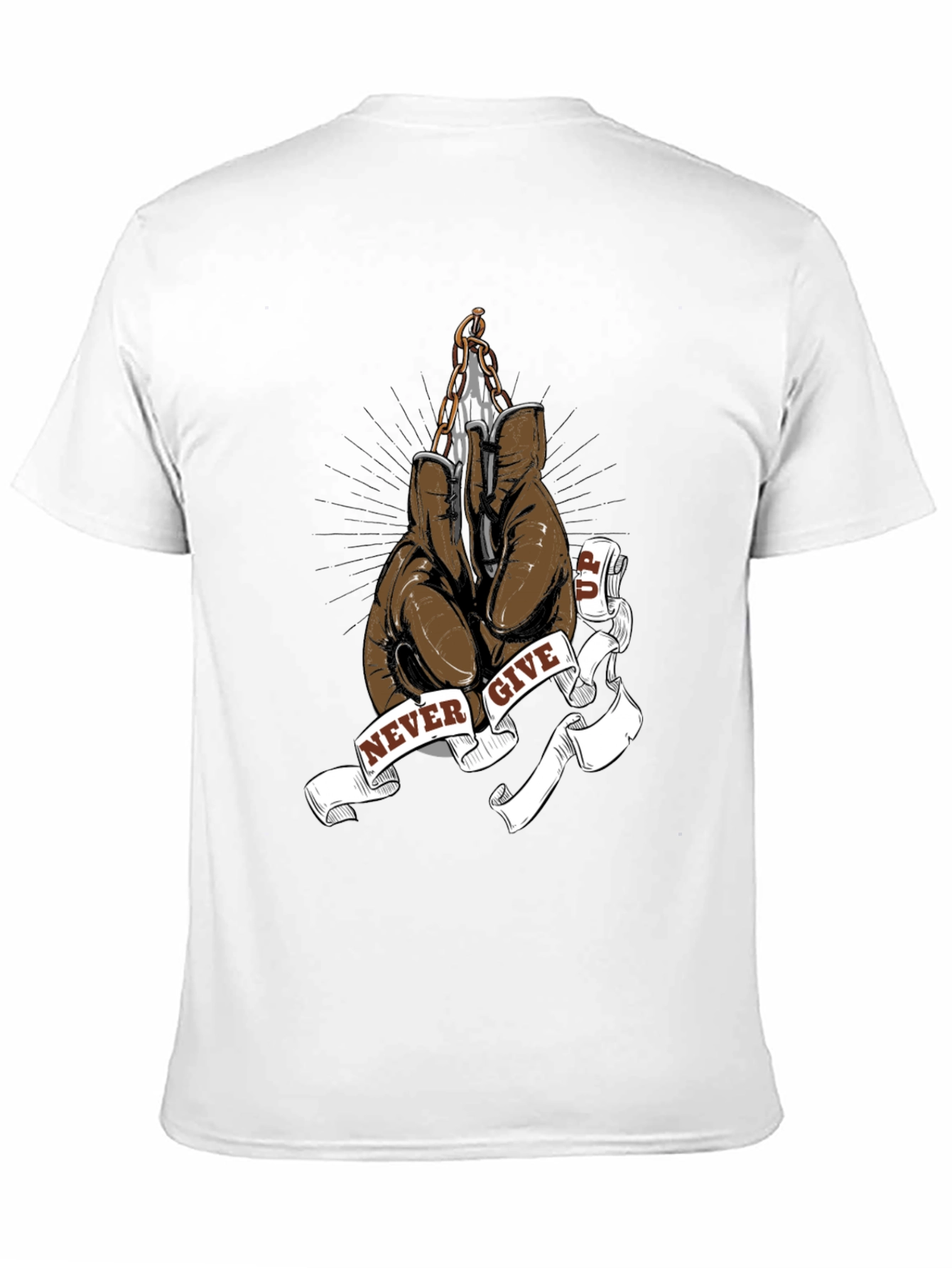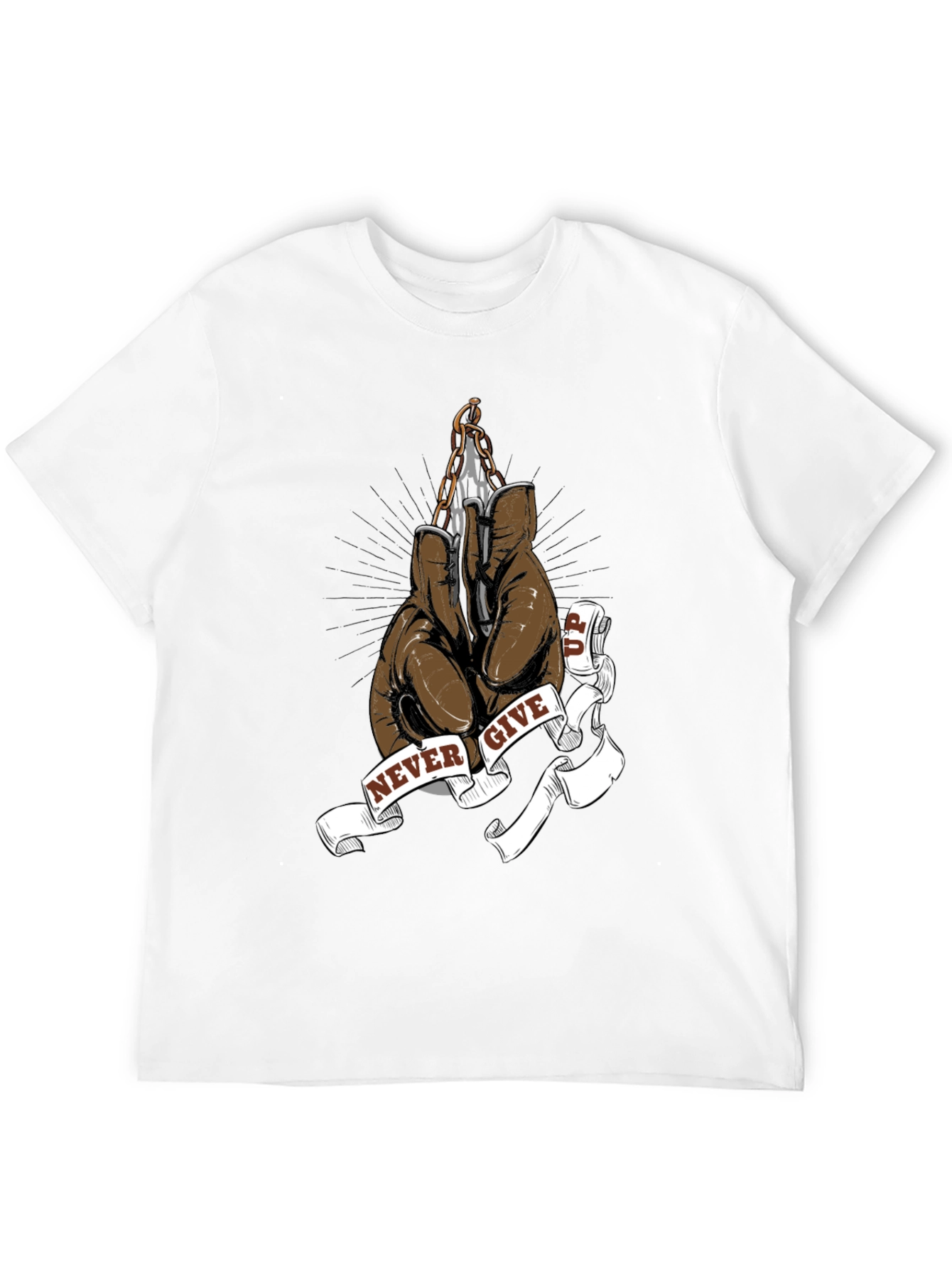 Show your fighting spirit with this bold graphic tee! This black t-shirt features a detailed illustration of vintage-style boxing gloves bound by a chain, with a motivational "Never Give Up" banner. The design is eye-catching and makes a statement. Made from comfortable fabric, it's perfect for everyday wear, workouts, or casual outings. Ideal for boxing enthusiasts or anyone who appreciates inspirational apparel. This tee combines style and motivation, making it a great addition to your wardrobe. Grab yours and keep fighting!