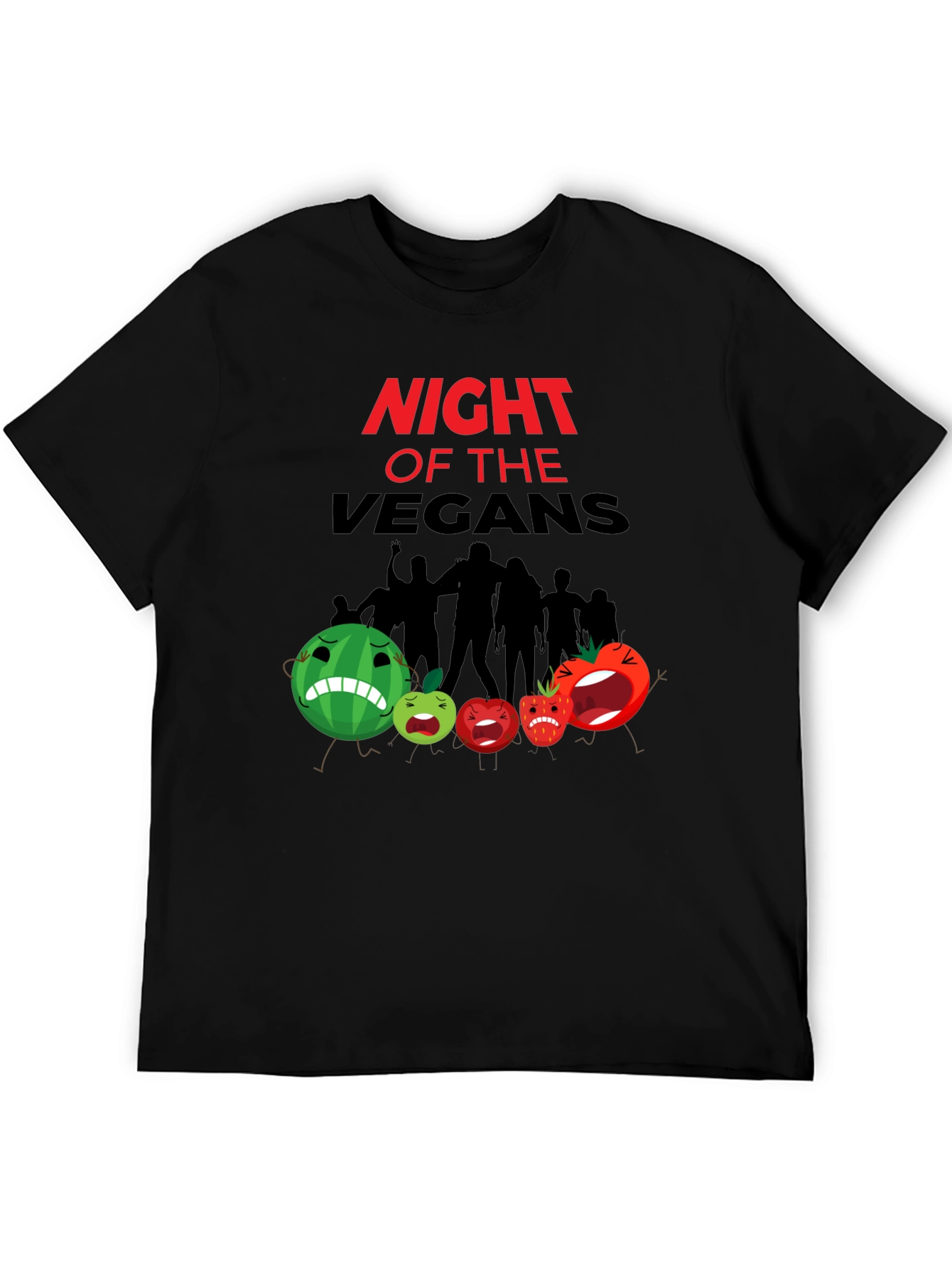 Embrace your plant-based lifestyle with this unique 'Night of the Vegans' graphic t-shirt. The shirt features a fun, cartoonish design of frightened fruits and vegetables. With the text 'Night of the Vegans' prominently displayed, this tee makes a statement. Made from comfortable fabric, it's perfect for everyday wear, vegan events, or casual outings. Stand out from the crowd and spark conversations with this eye-catching and conversation-starting t-shirt that's sure to appeal to vegans, vegetarians, and anyone with a sense of humor.