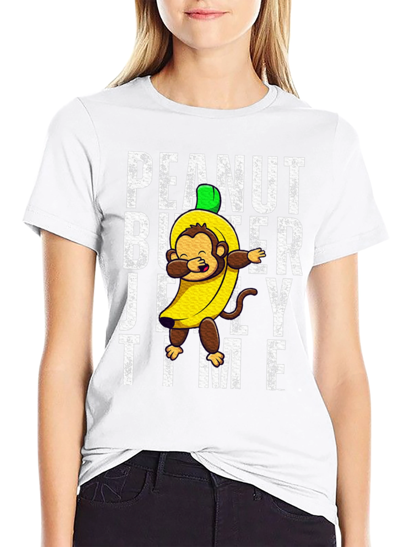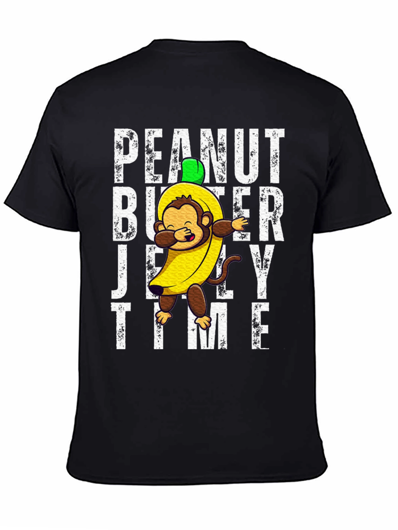 Show off your fun side with this unique Peanut Butter Jelly Time t-shirt. Featuring a cartoon monkey dressed in a banana costume, this tee is sure to turn heads. The playful design is printed on a comfortable, breathable fabric, perfect for everyday wear. The bold lettering and eye-catching graphics make it a standout piece in any wardrobe. Ideal for casual outings, parties, or just lounging around, this t-shirt combines comfort with a whimsical touch. Get ready to spread some smiles and peanut butter jelly vibes wherever you go!