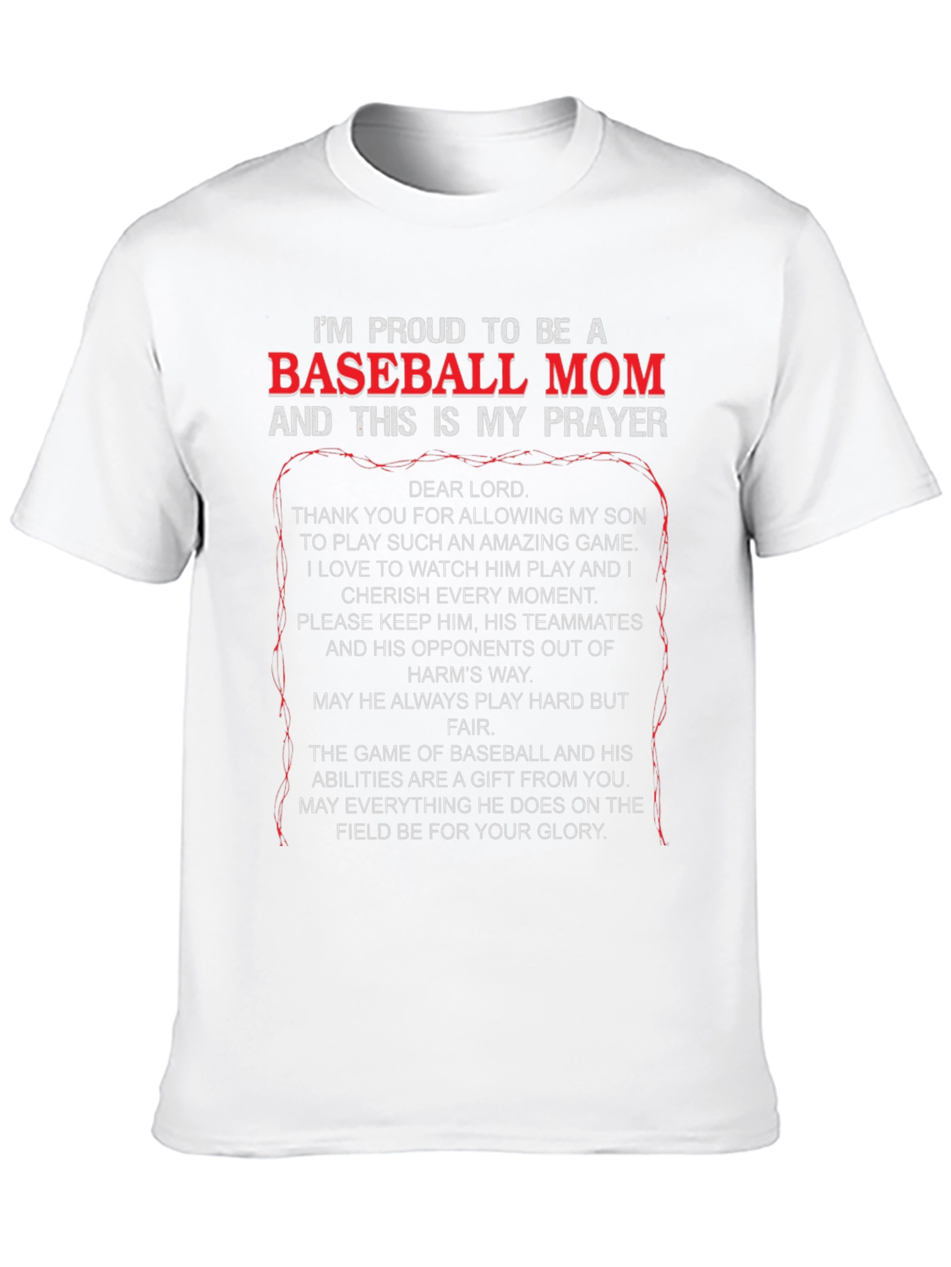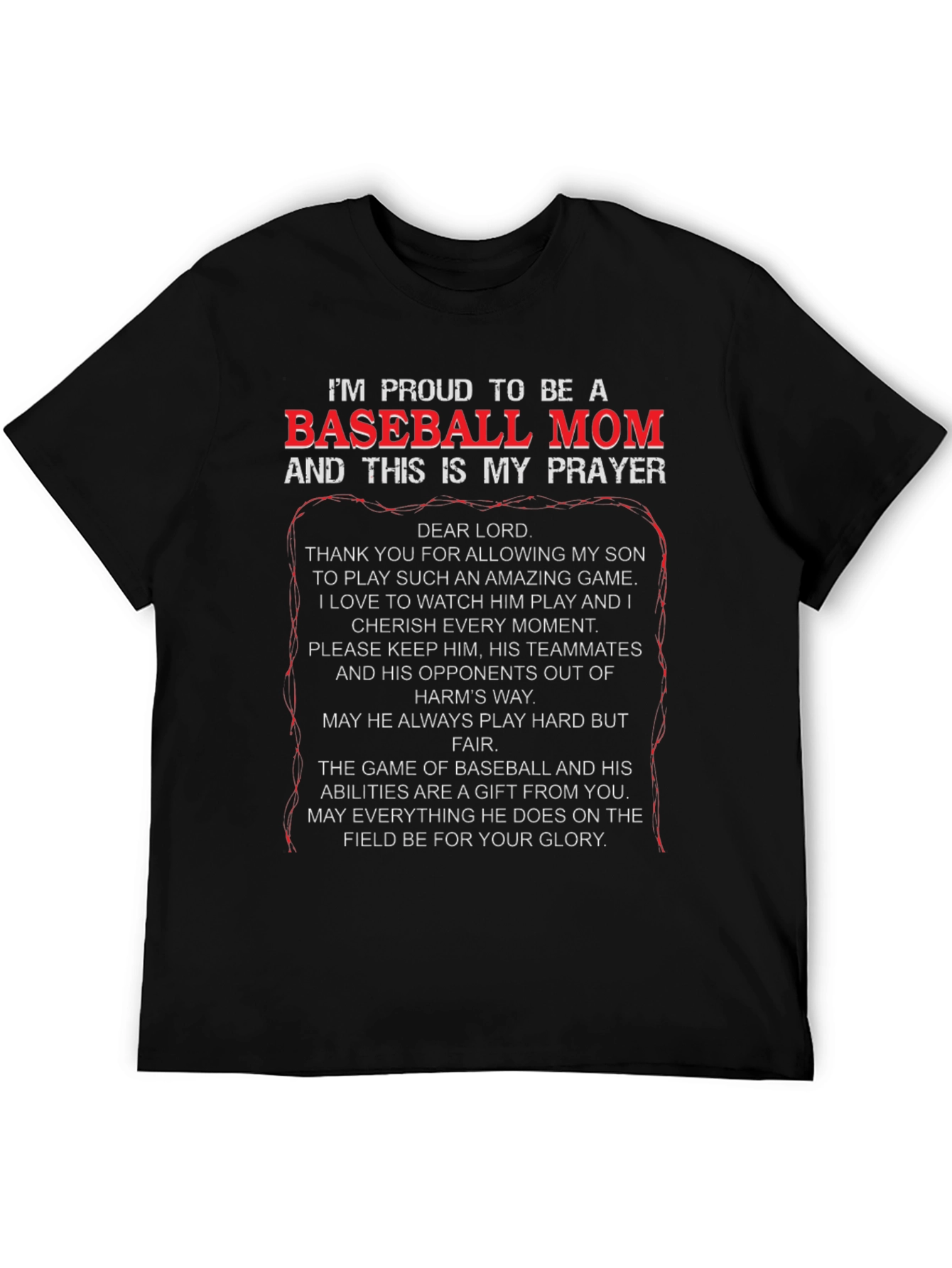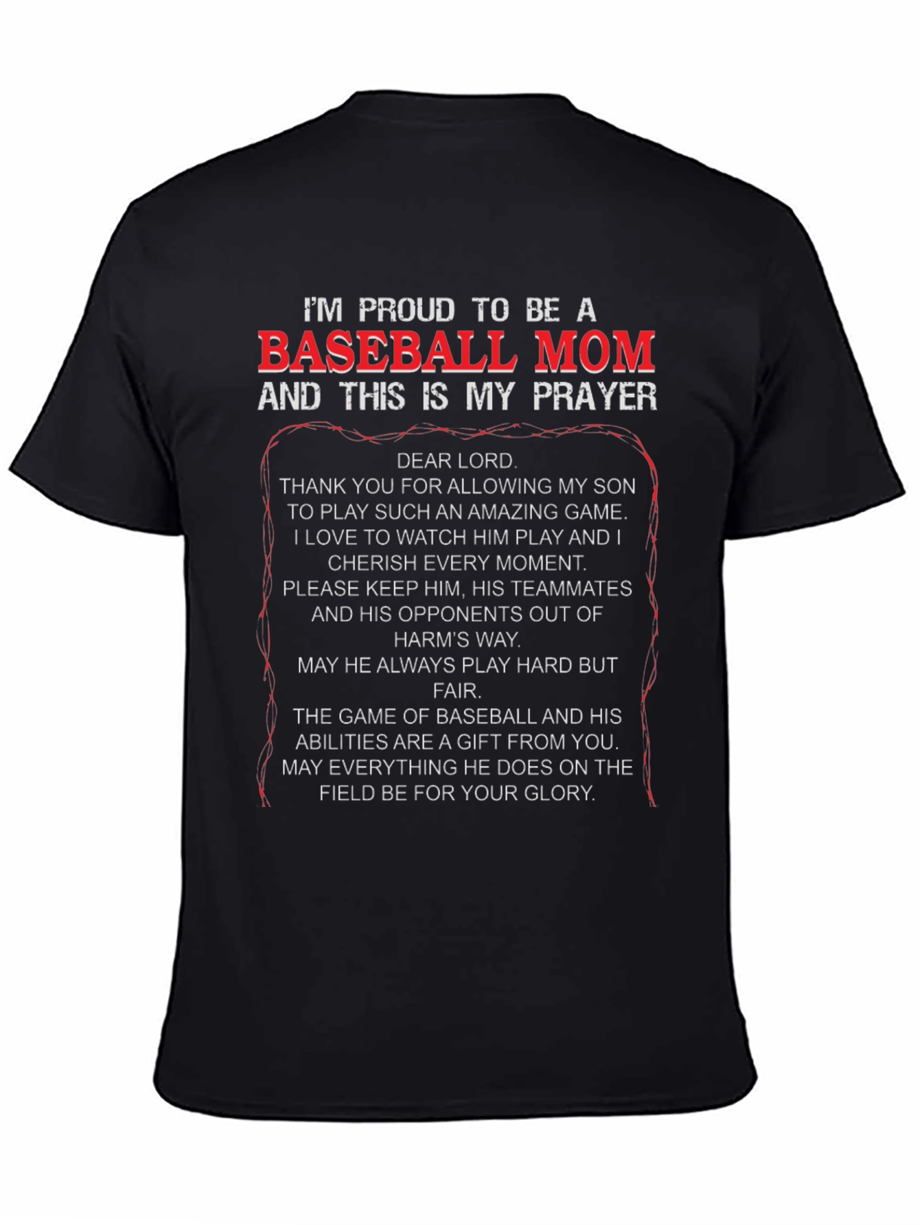 Show your support with this black "Proud to be a Baseball Mom" t-shirt! Featuring a heartfelt prayer for your son, this tee is perfect for game days and everyday wear. The striking white and red text ensures you'll stand out in the stands. Made from comfortable material, it's designed for all-day wear. Let everyone know you're a devoted baseball mom with this unique and meaningful shirt. A perfect gift for yourself or the baseball mom in your life!