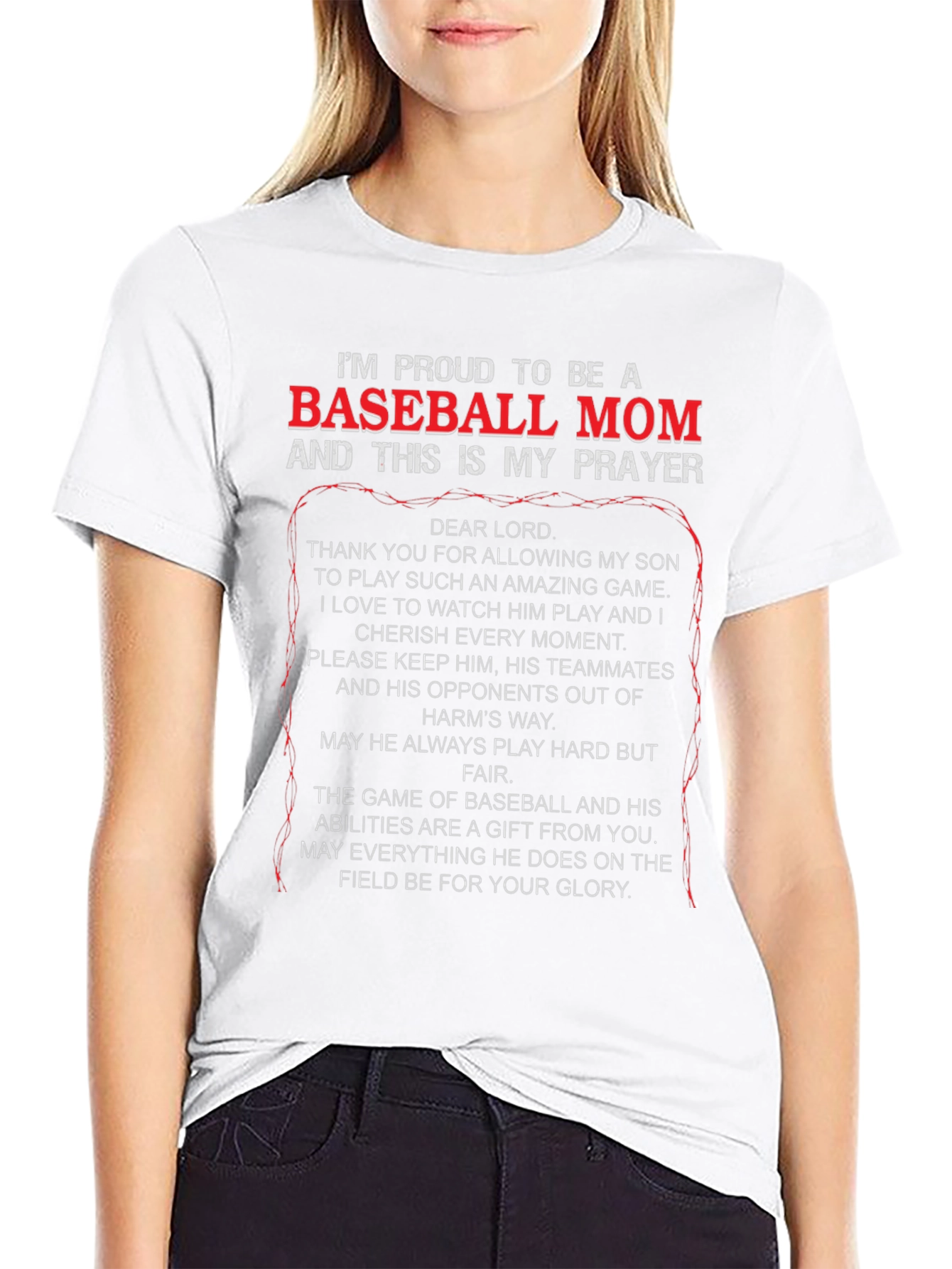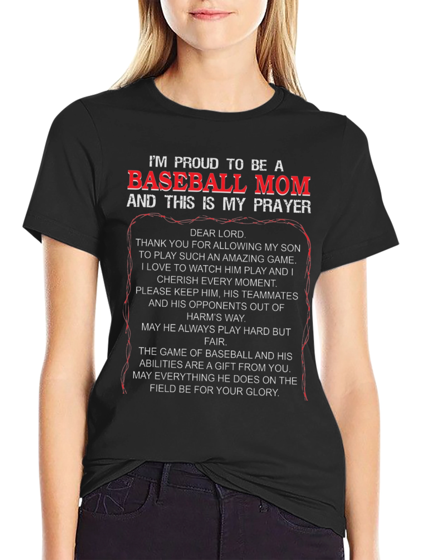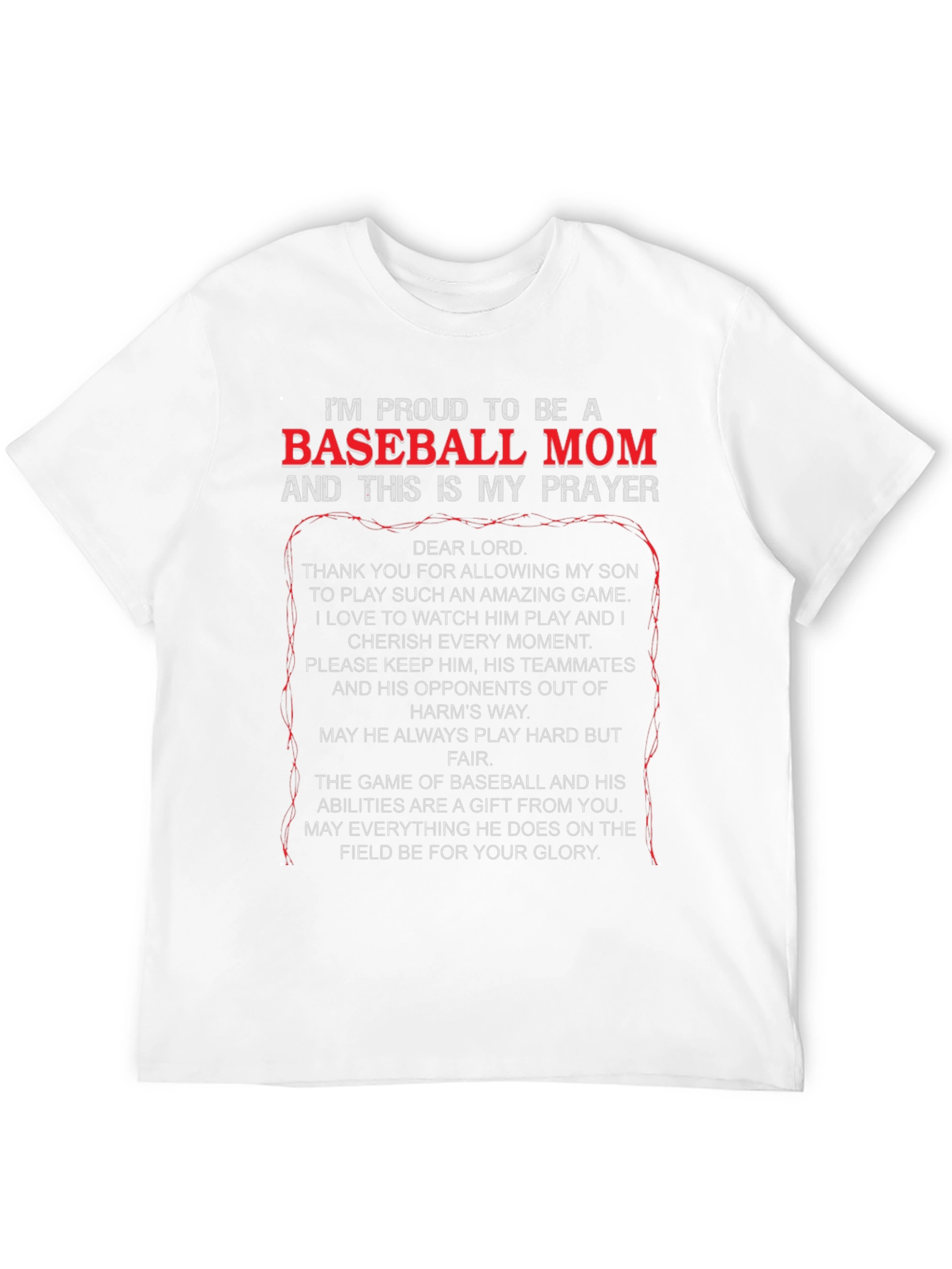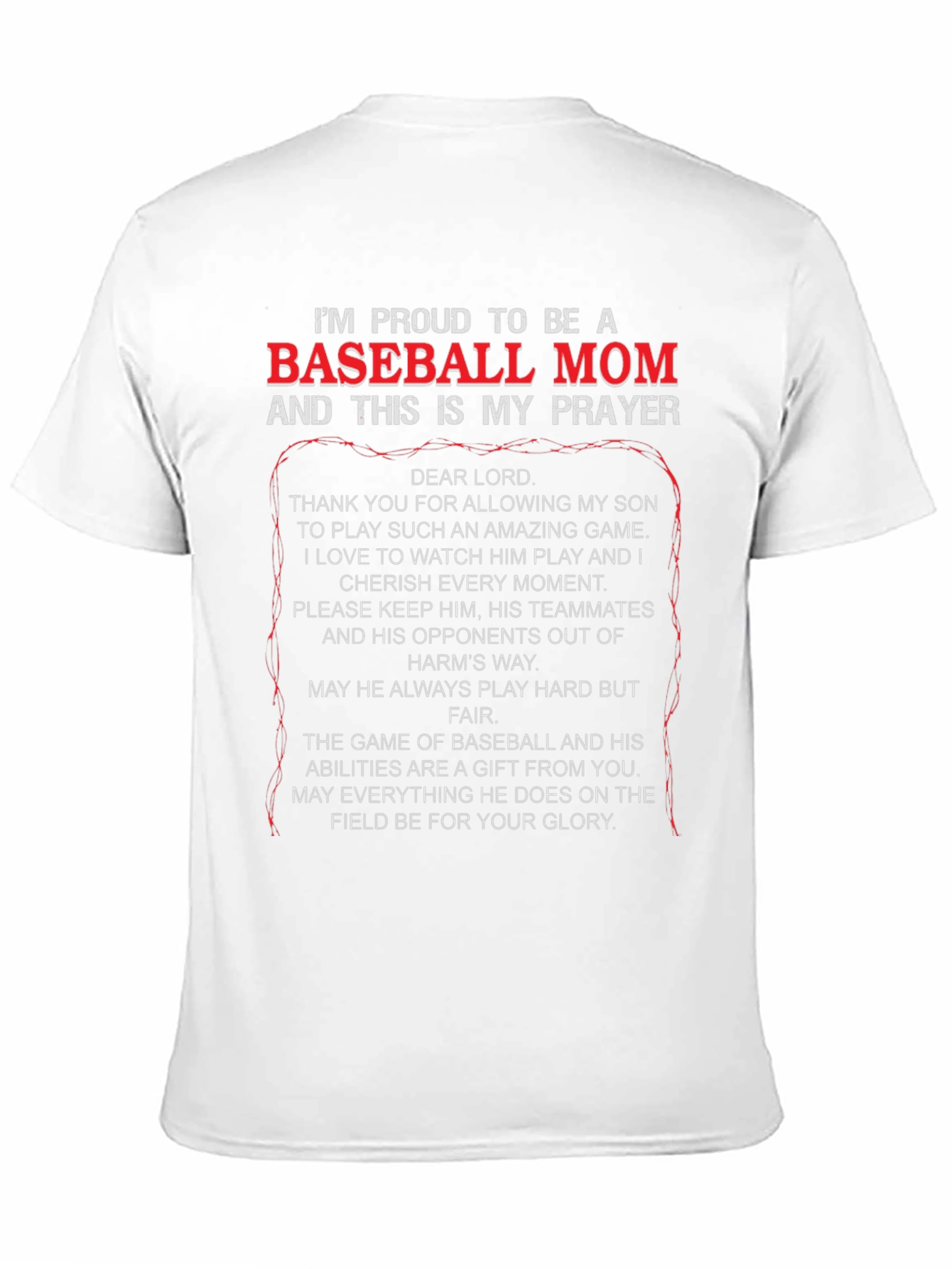 Show your support with this black "Proud to be a Baseball Mom" t-shirt! Featuring a heartfelt prayer for your son, this tee is perfect for game days and everyday wear. The striking white and red text ensures you'll stand out in the stands. Made from comfortable material, it's designed for all-day wear. Let everyone know you're a devoted baseball mom with this unique and meaningful shirt. A perfect gift for yourself or the baseball mom in your life!