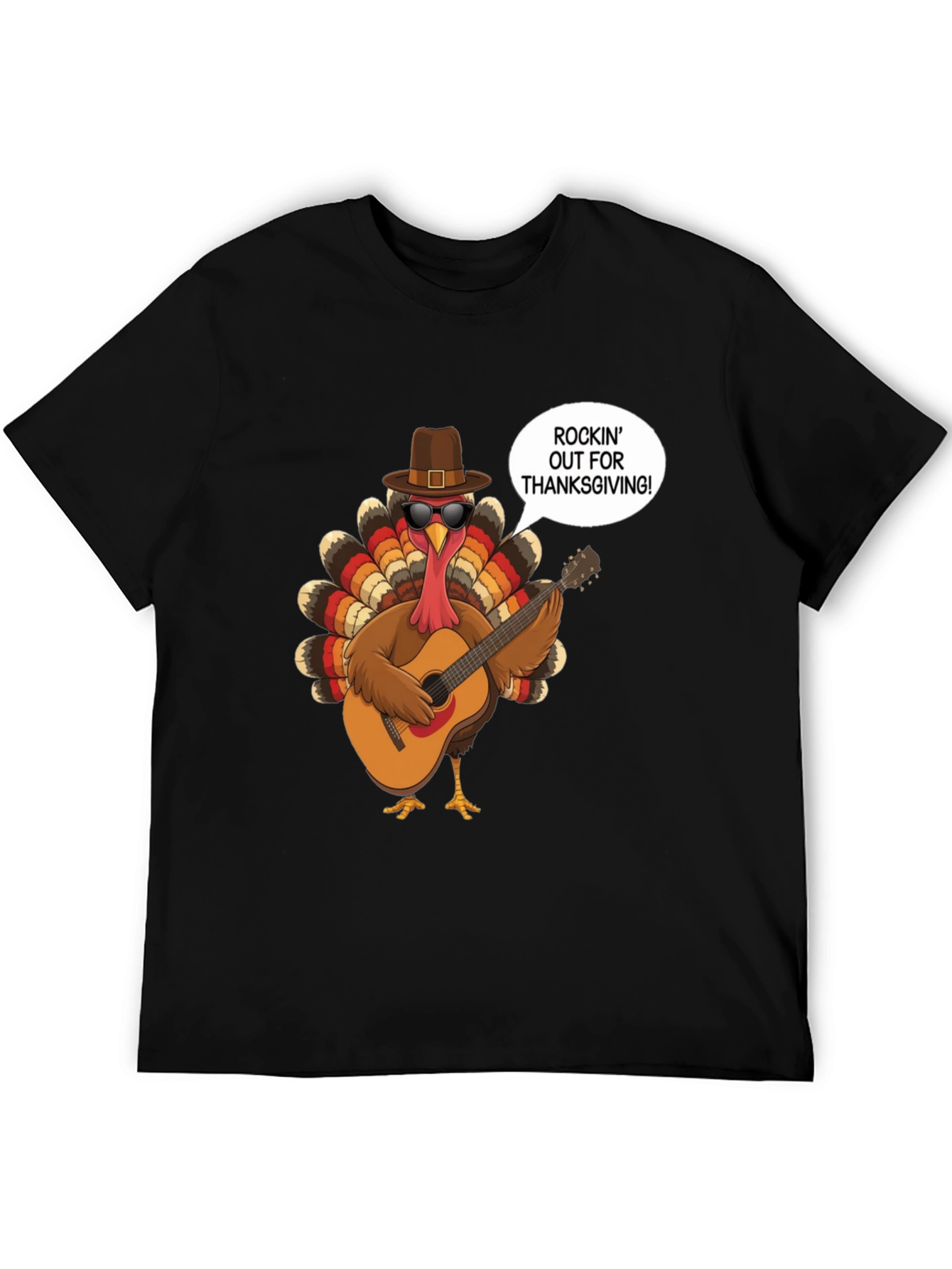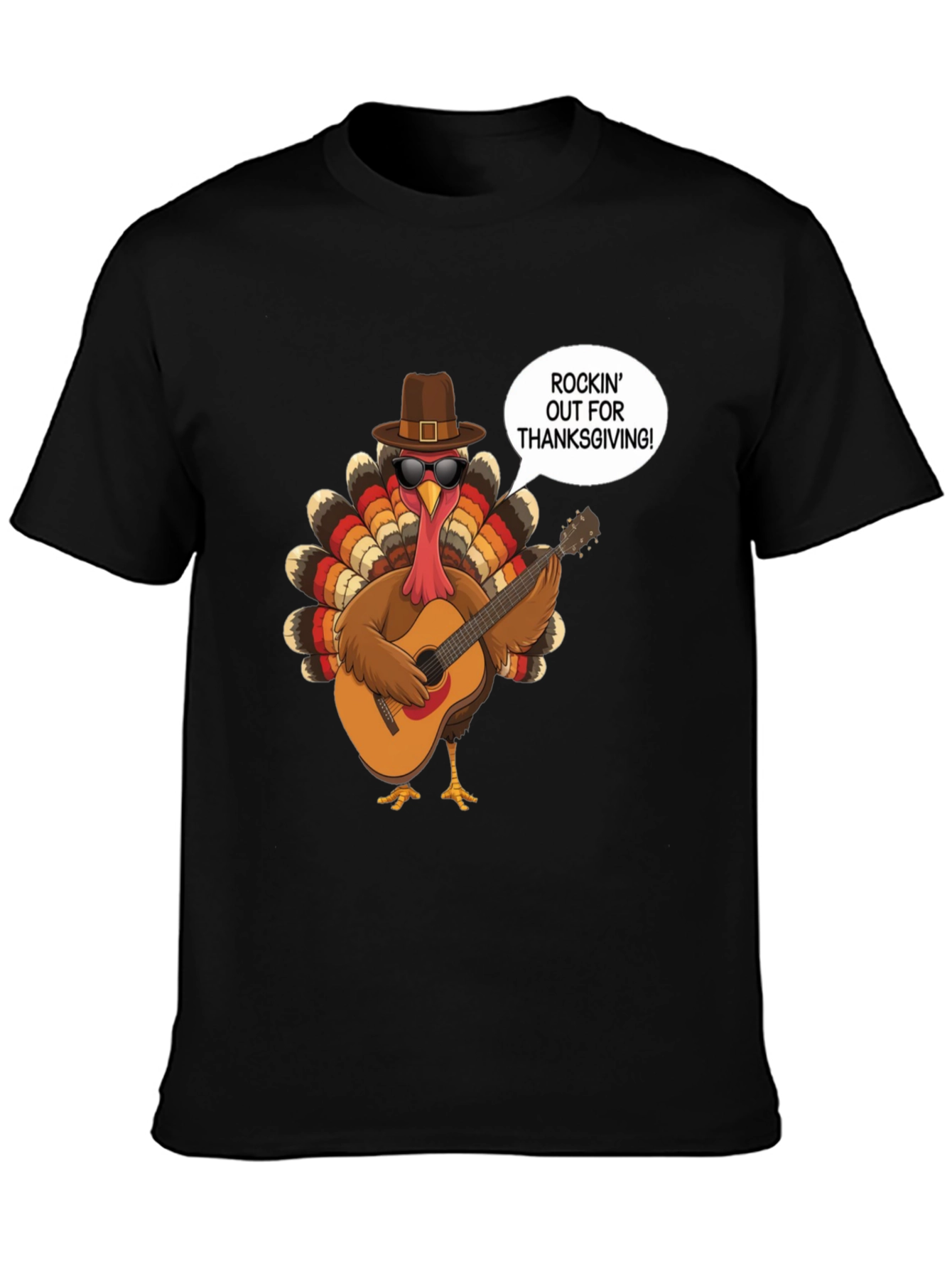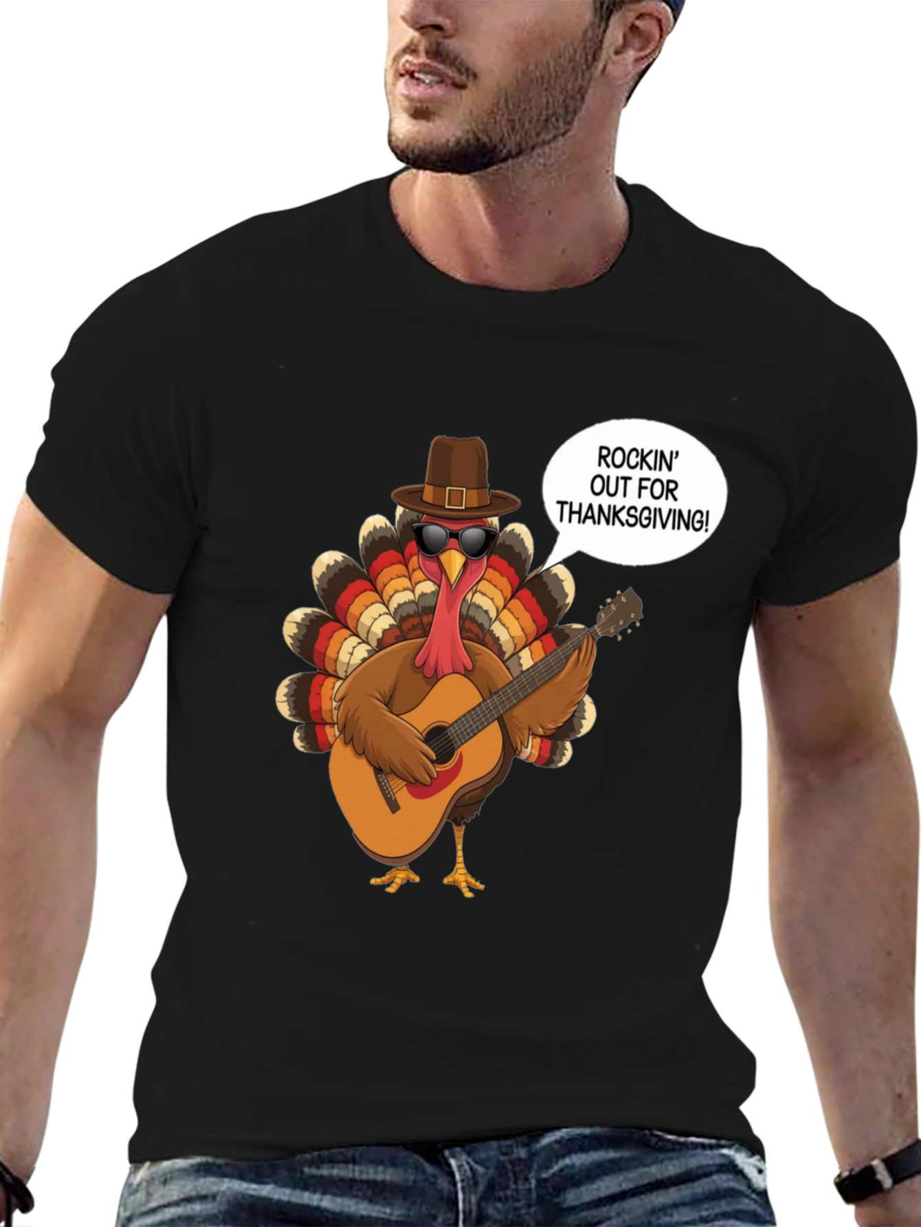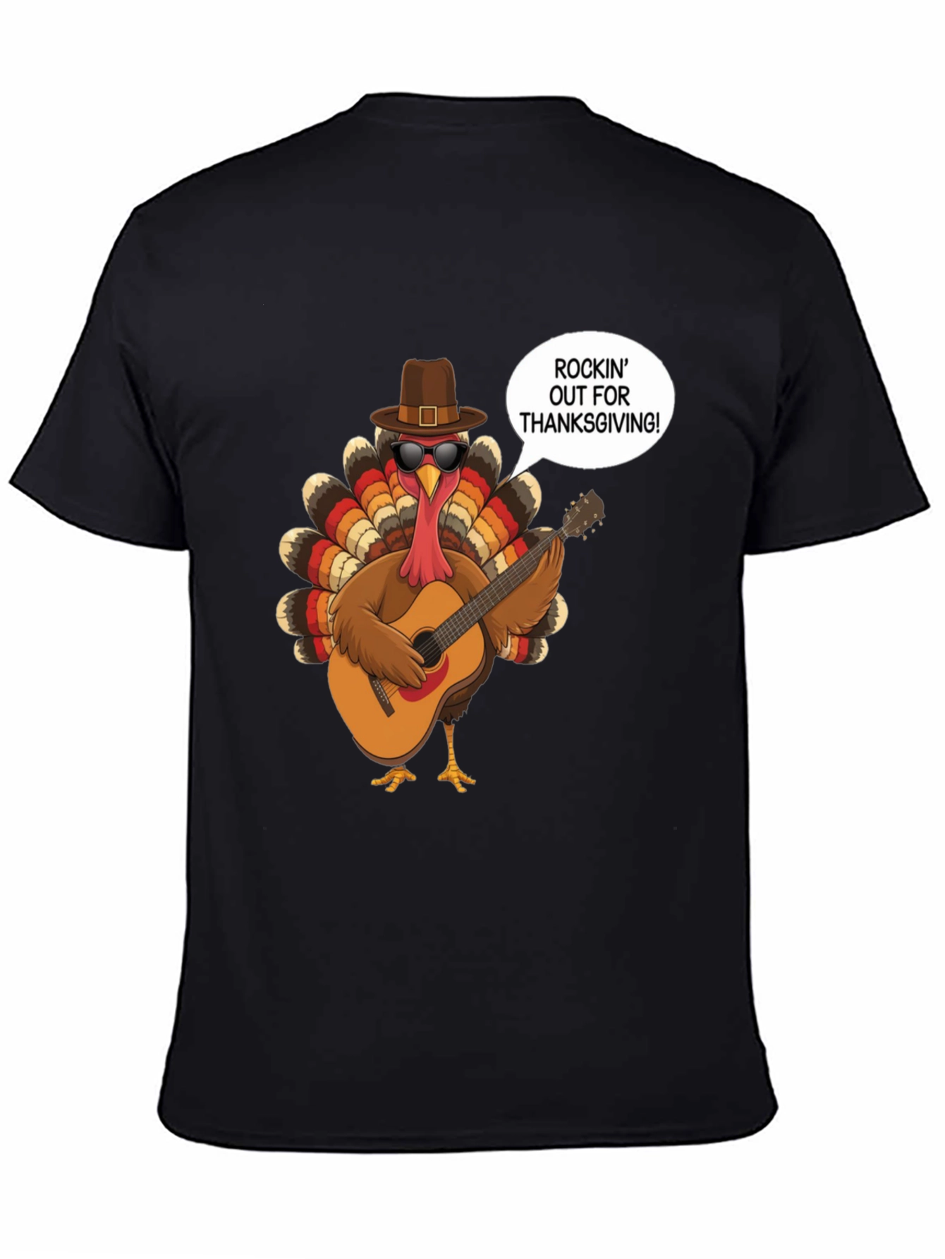 Get ready to rock this Thanksgiving with this unique graphic tee! The shirt features a cartoon turkey sporting sunglasses and a hat, strumming a guitar with the speech bubble 'Rockin' out for Thanksgiving!'. The design is printed on a comfortable black tee. The relaxed fit makes it perfect for holiday celebrations or casual outings. Express your festive spirit with this eye-catching and fun tee! Perfect for Thanksgiving parties, family gatherings, or just showing off your love for the holiday season. This tee is sure to be a conversation starter and will bring smiles to everyone around you.