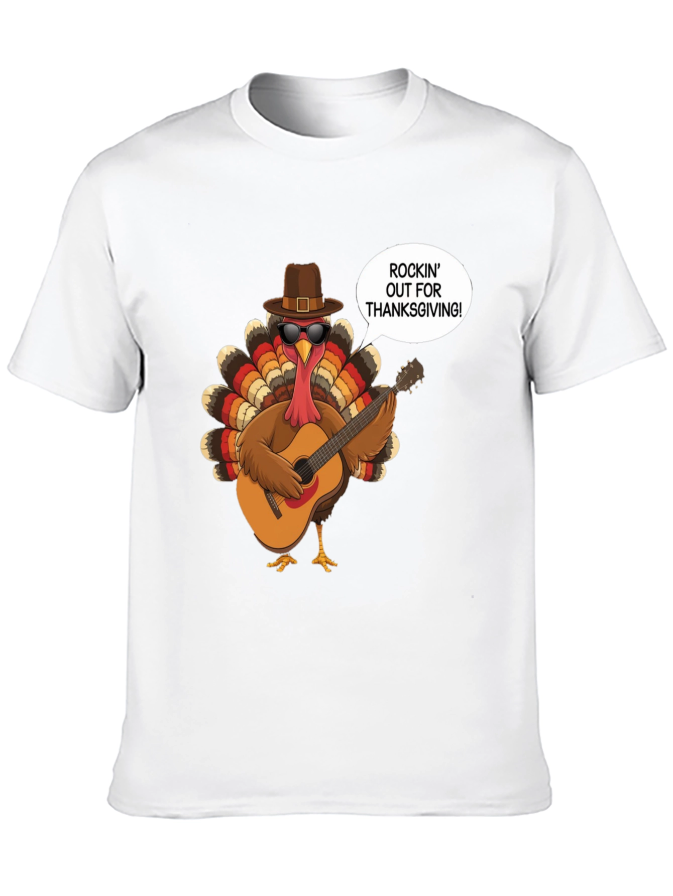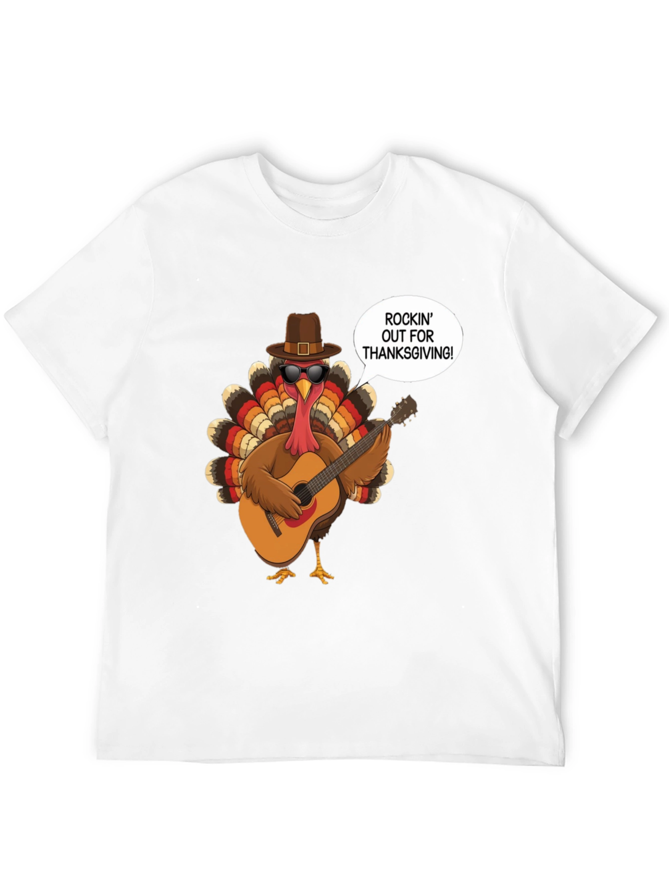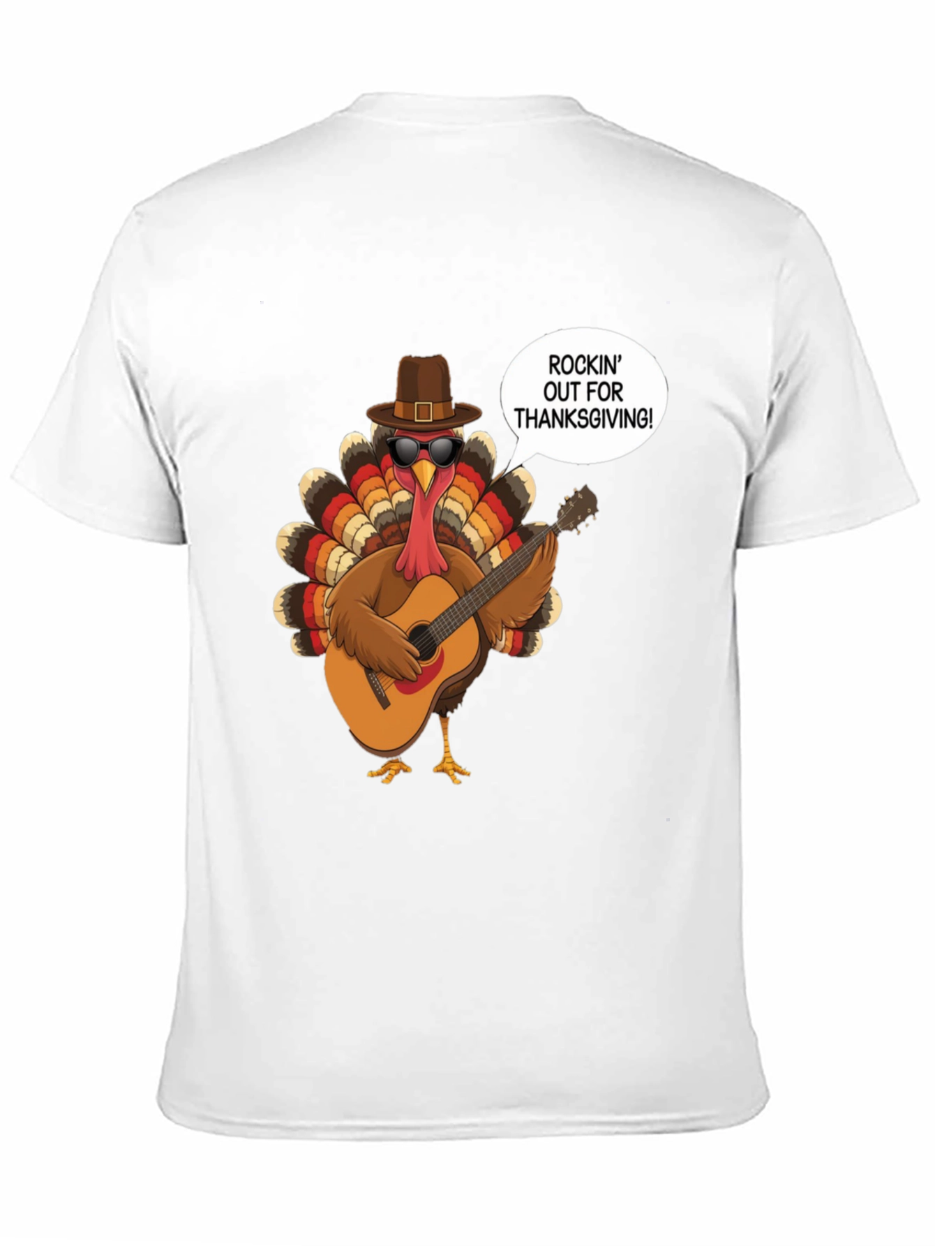 Get ready to rock this Thanksgiving with this unique graphic tee! The shirt features a cartoon turkey sporting sunglasses and a hat, strumming a guitar with the speech bubble 'Rockin' out for Thanksgiving!'. The design is printed on a comfortable black tee. The relaxed fit makes it perfect for holiday celebrations or casual outings. Express your festive spirit with this eye-catching and fun tee! Perfect for Thanksgiving parties, family gatherings, or just showing off your love for the holiday season. This tee is sure to be a conversation starter and will bring smiles to everyone around you.