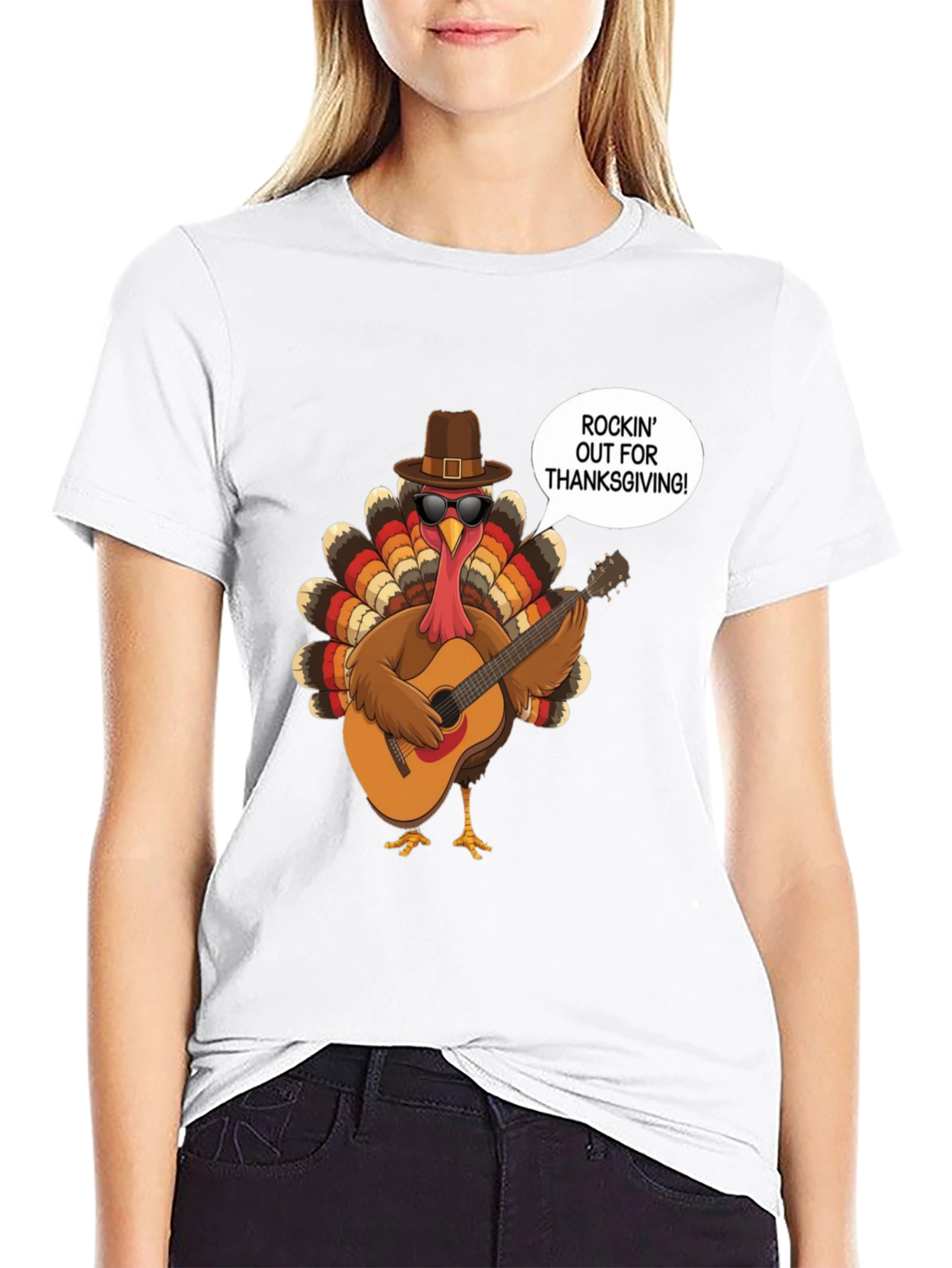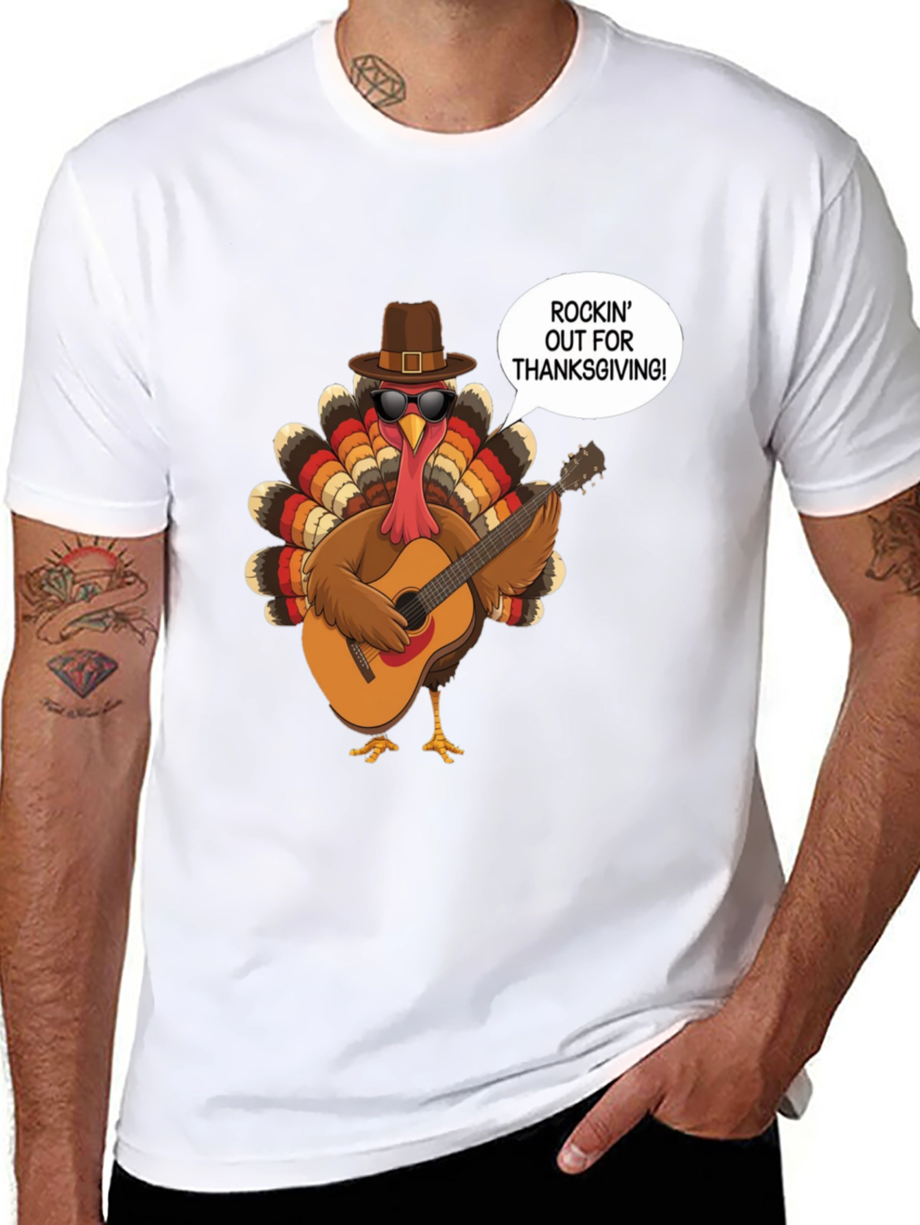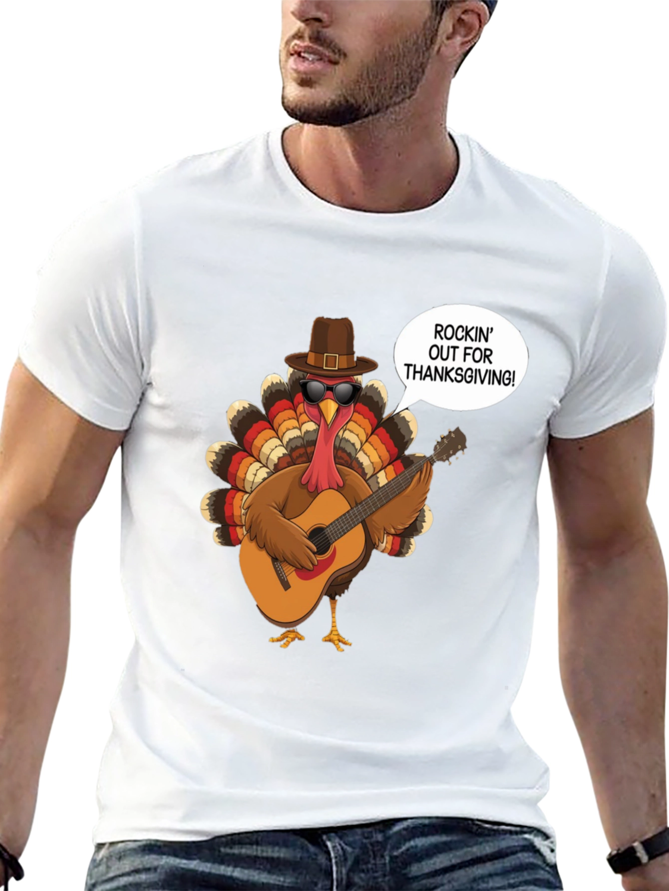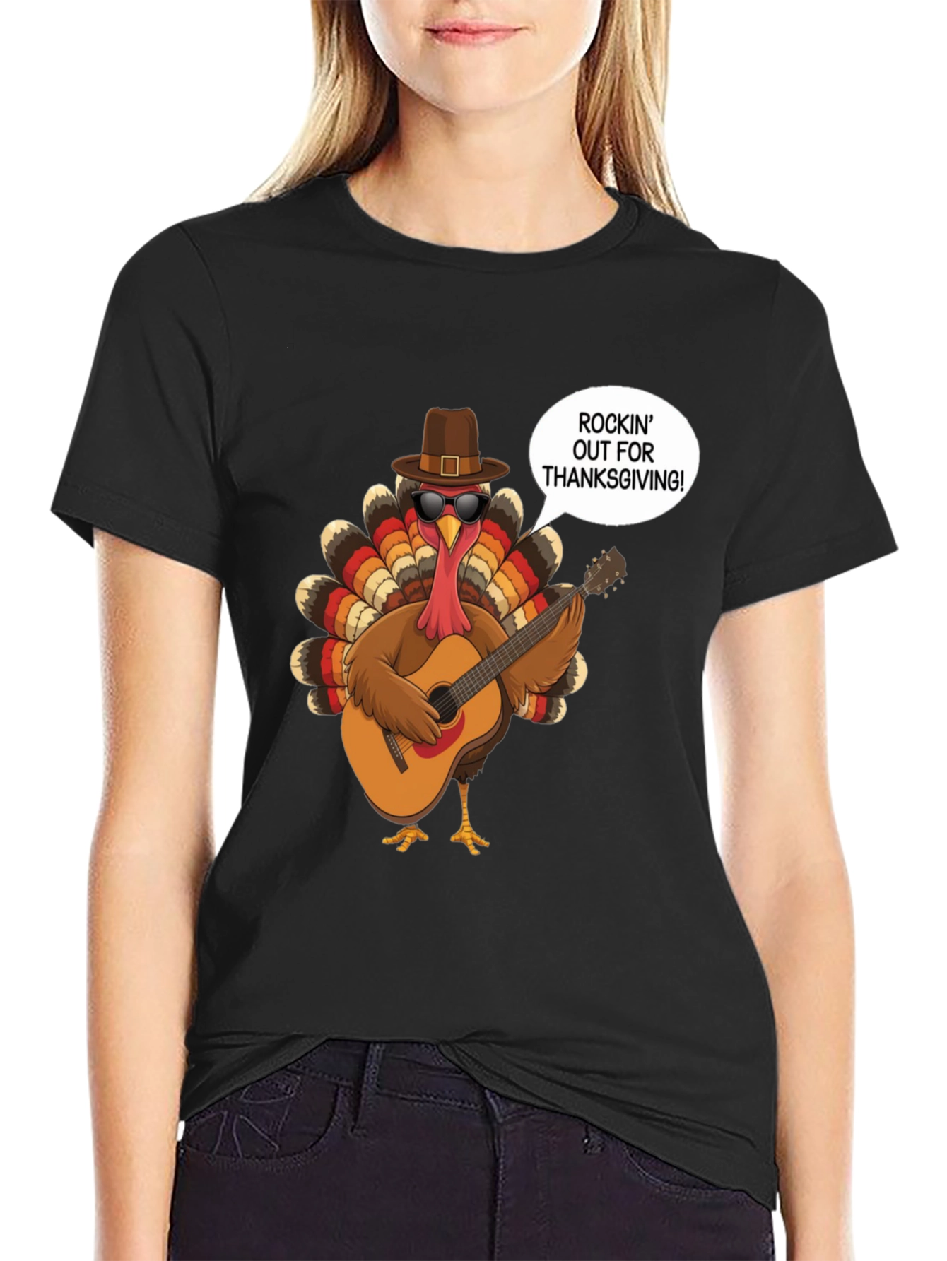 Get ready to rock this Thanksgiving with this unique graphic tee! The shirt features a cartoon turkey sporting sunglasses and a hat, strumming a guitar with the speech bubble 'Rockin' out for Thanksgiving!'. The design is printed on a comfortable black tee. The relaxed fit makes it perfect for holiday celebrations or casual outings. Express your festive spirit with this eye-catching and fun tee! Perfect for Thanksgiving parties, family gatherings, or just showing off your love for the holiday season. This tee is sure to be a conversation starter and will bring smiles to everyone around you.