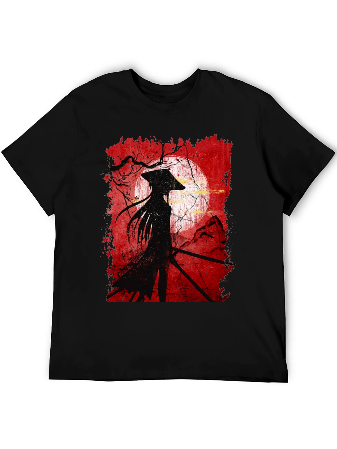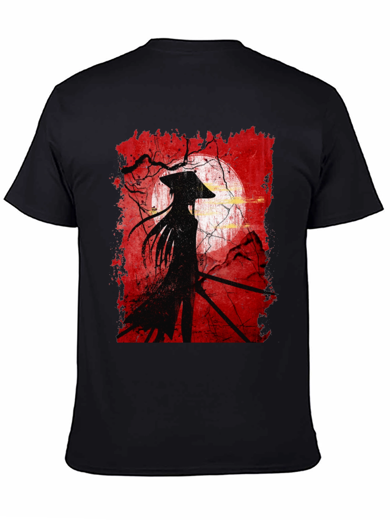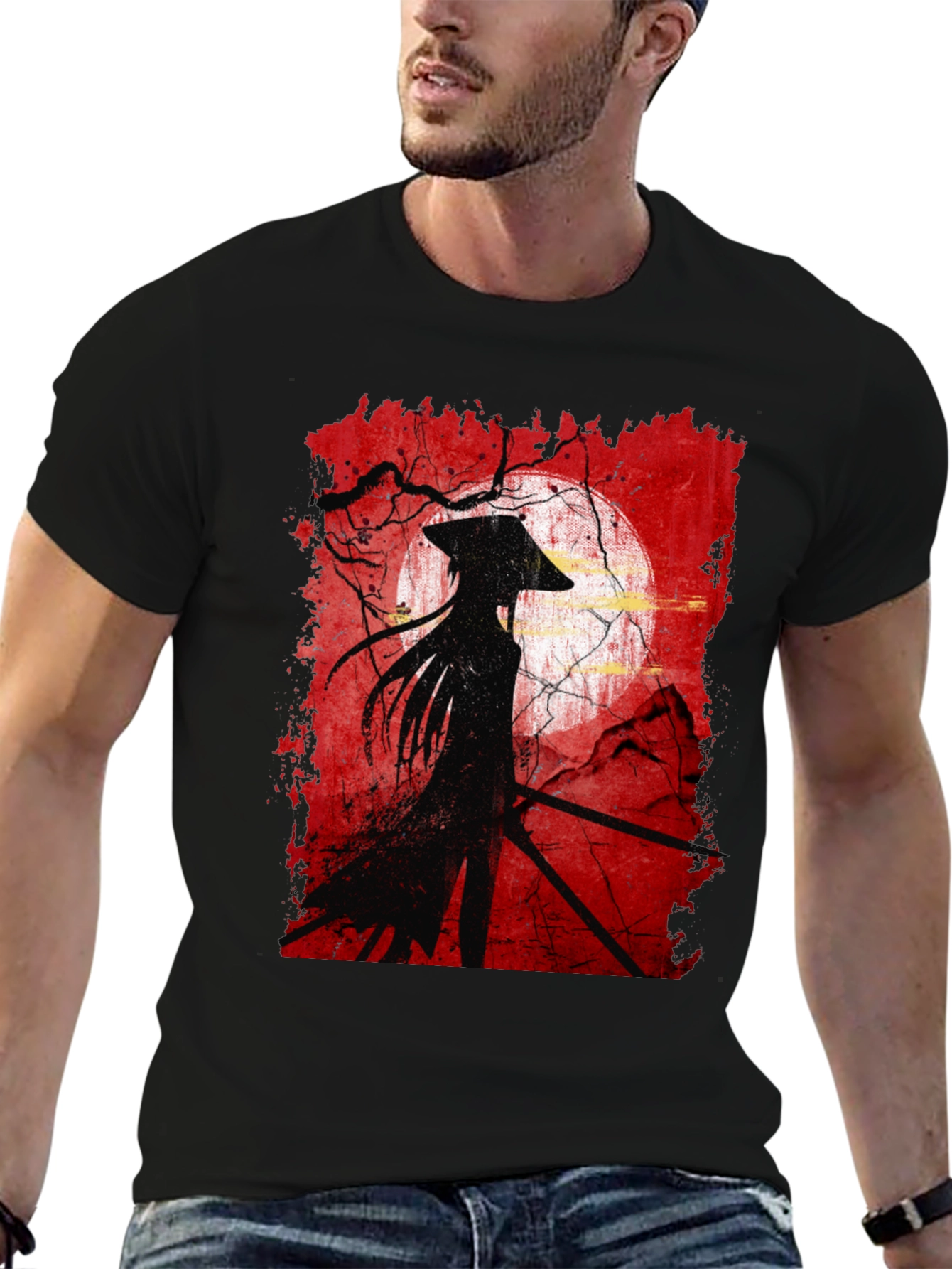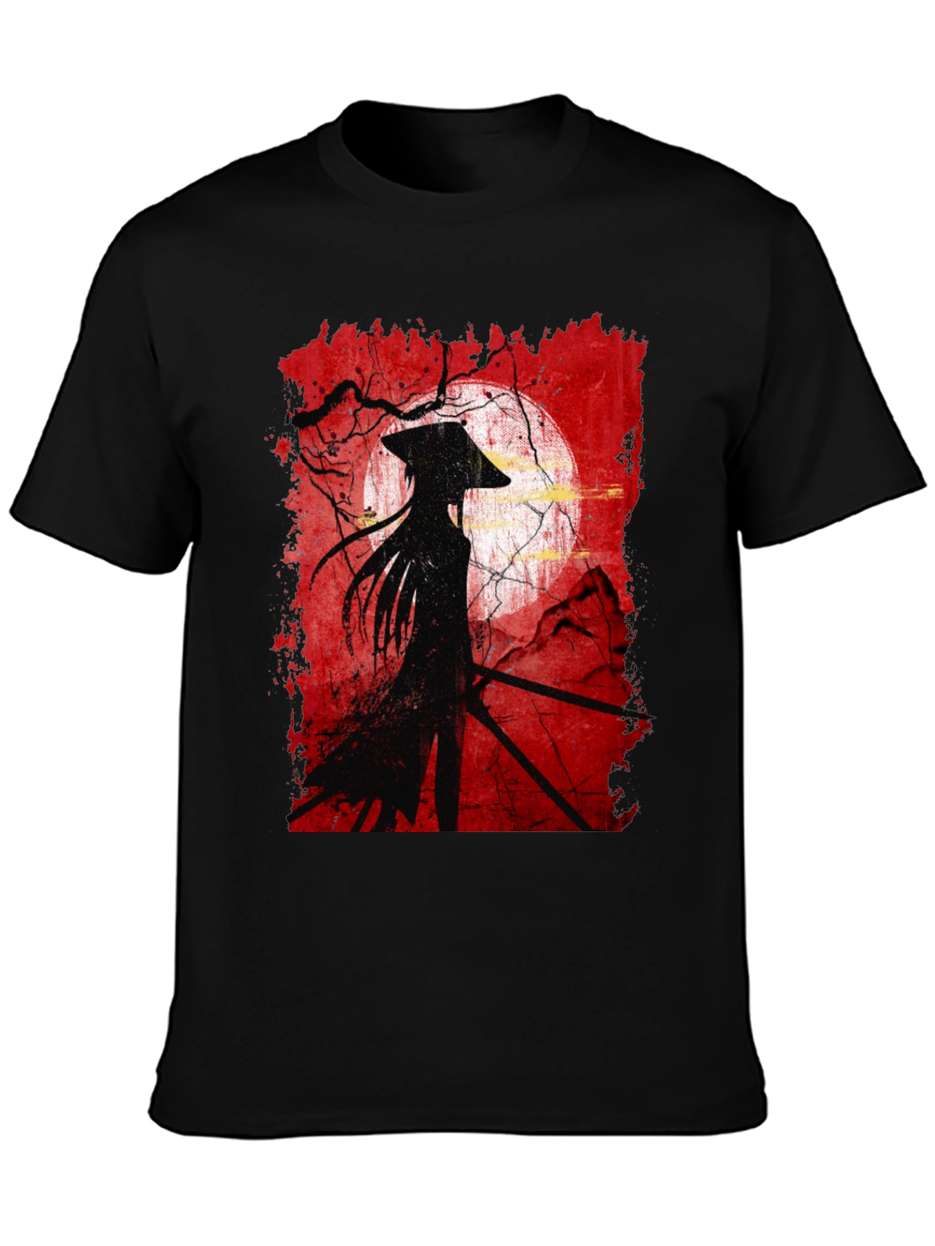 Embrace a touch of mystique with this striking men's black T-shirt. The tee features a bold graphic print of a samurai silhouette against a red and white backdrop reminiscent of a full moon. The artistic design incorporates tree branches and a hint of gold light, creating a visually captivating aesthetic. Crafted from a comfortable-looking material, this tee offers both style and comfort. Ideal for casual wear, it's perfect for those who appreciate unique, eye-catching designs. Show off your individuality with this artistic samurai graphic tee.