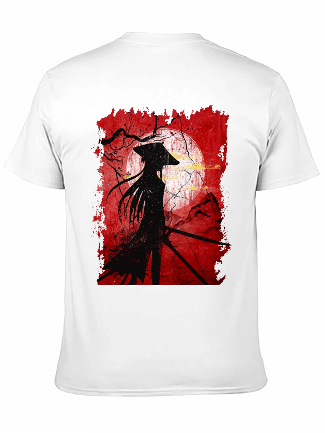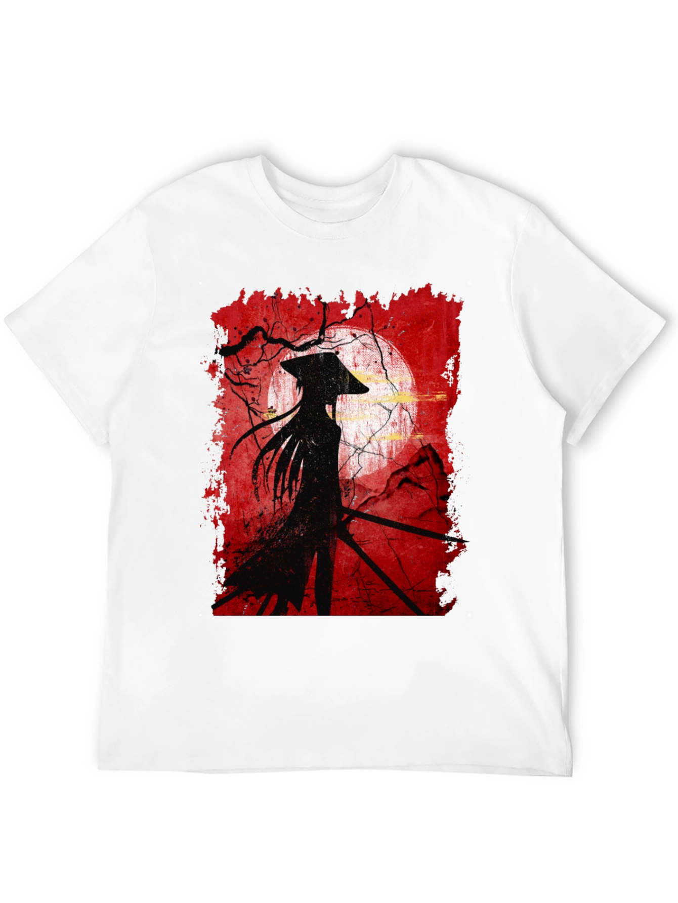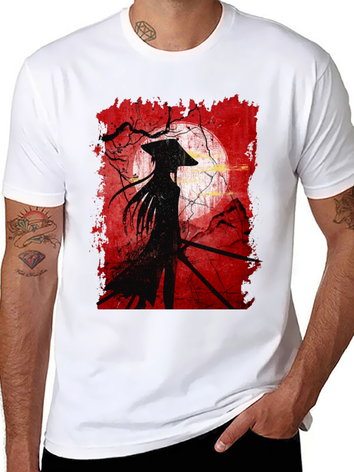 Embrace a touch of mystique with this striking men's black T-shirt. The tee features a bold graphic print of a samurai silhouette against a red and white backdrop reminiscent of a full moon. The artistic design incorporates tree branches and a hint of gold light, creating a visually captivating aesthetic. Crafted from a comfortable-looking material, this tee offers both style and comfort. Ideal for casual wear, it's perfect for those who appreciate unique, eye-catching designs. Show off your individuality with this artistic samurai graphic tee.
