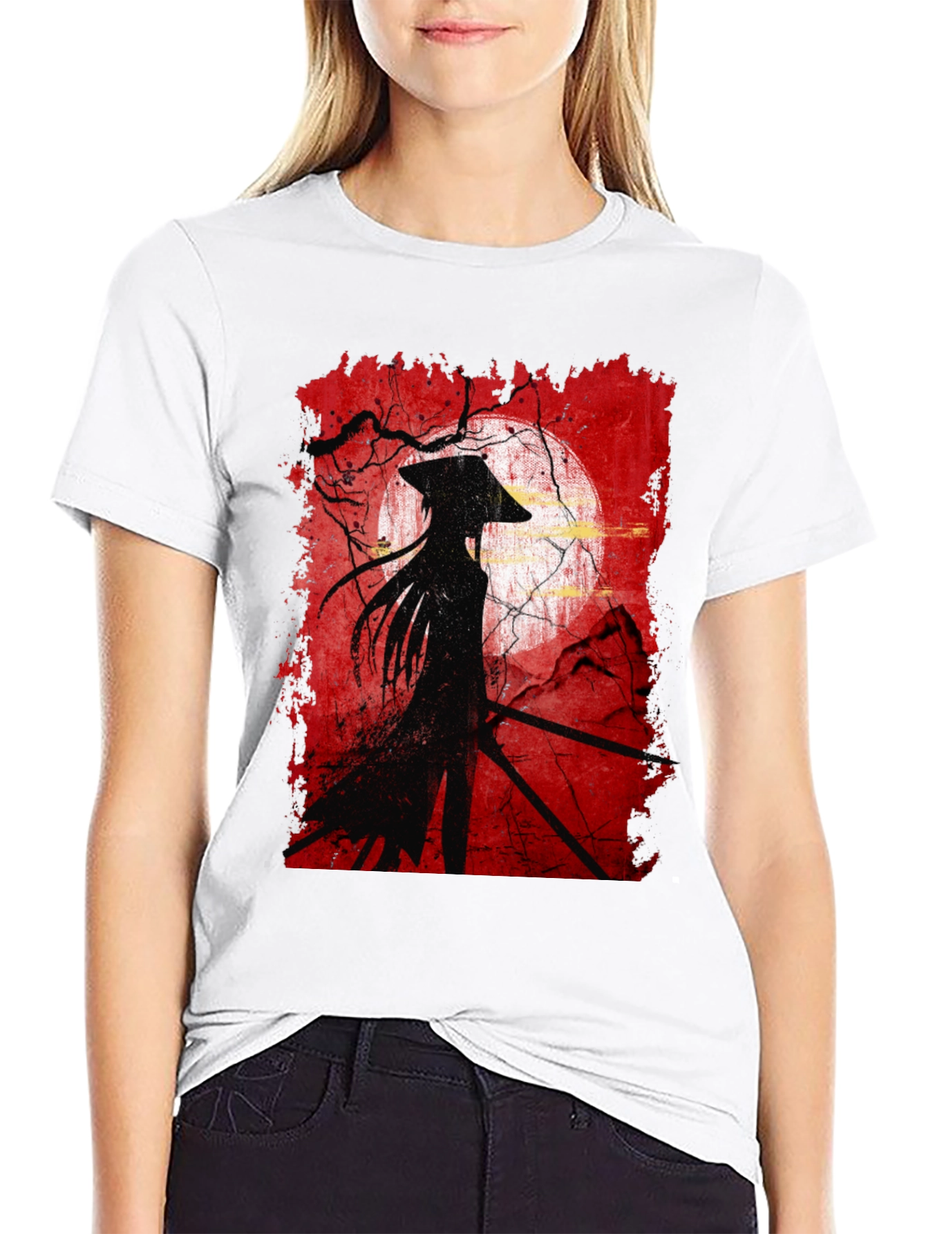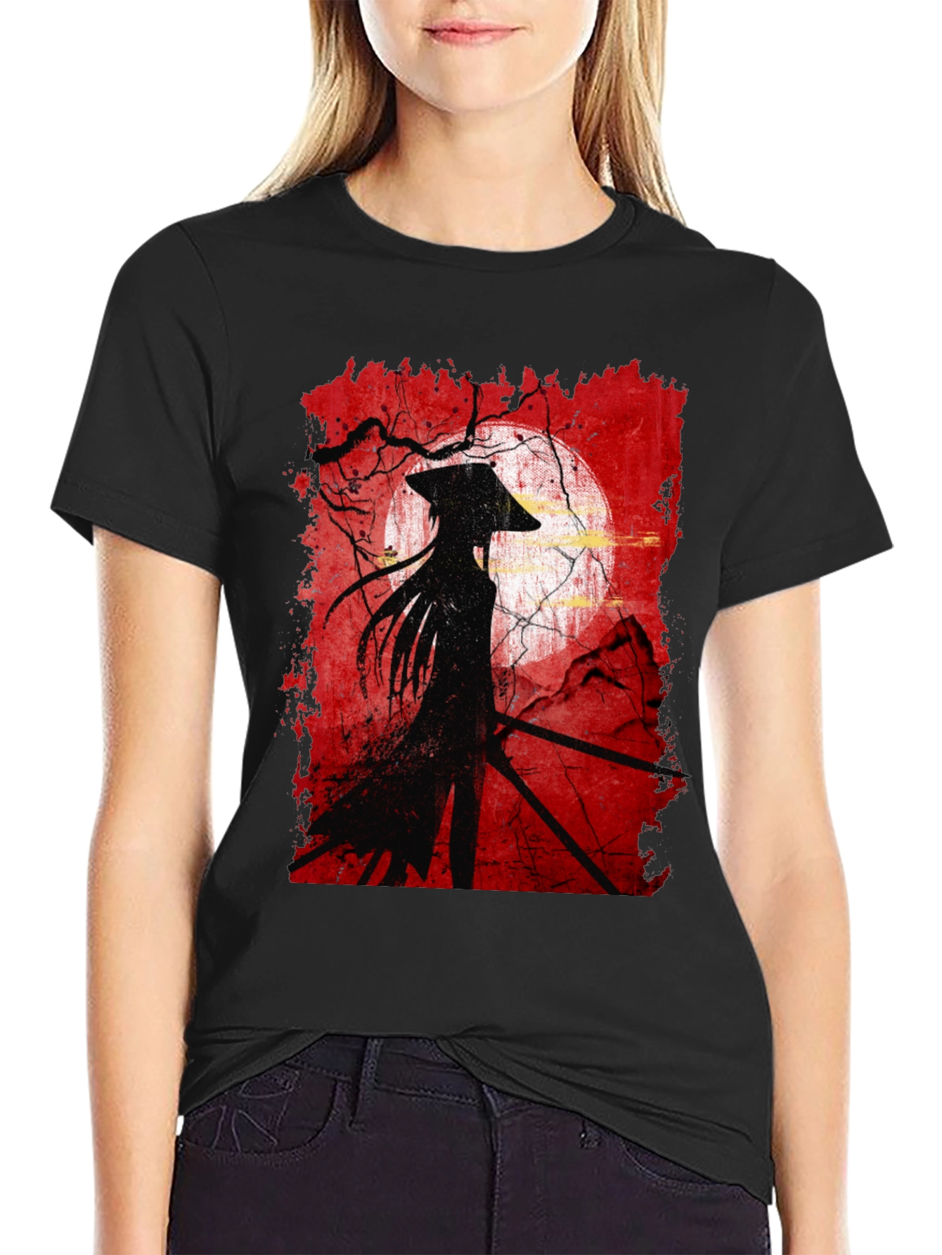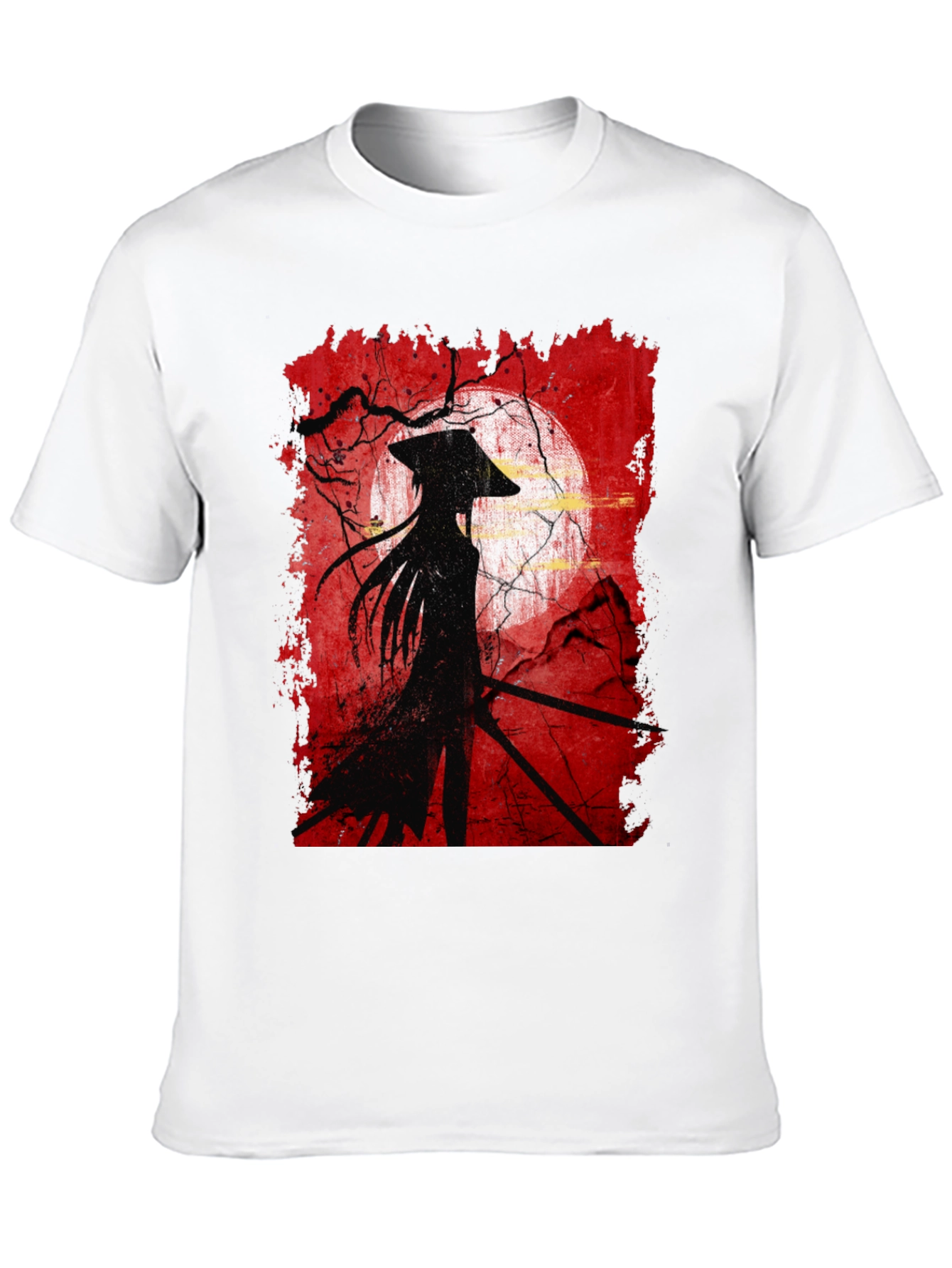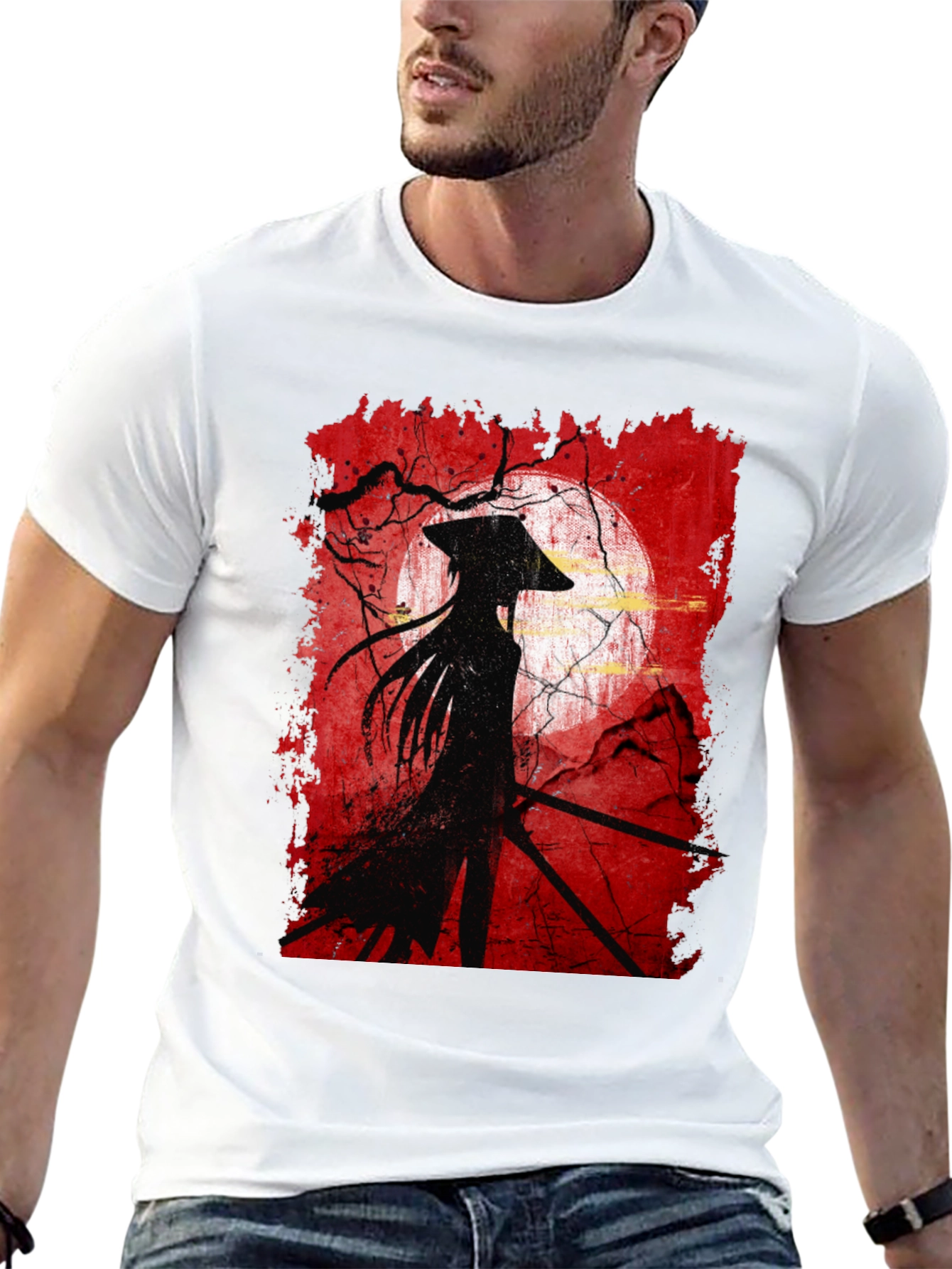 Embrace a touch of mystique with this striking men's black T-shirt. The tee features a bold graphic print of a samurai silhouette against a red and white backdrop reminiscent of a full moon. The artistic design incorporates tree branches and a hint of gold light, creating a visually captivating aesthetic. Crafted from a comfortable-looking material, this tee offers both style and comfort. Ideal for casual wear, it's perfect for those who appreciate unique, eye-catching designs. Show off your individuality with this artistic samurai graphic tee.