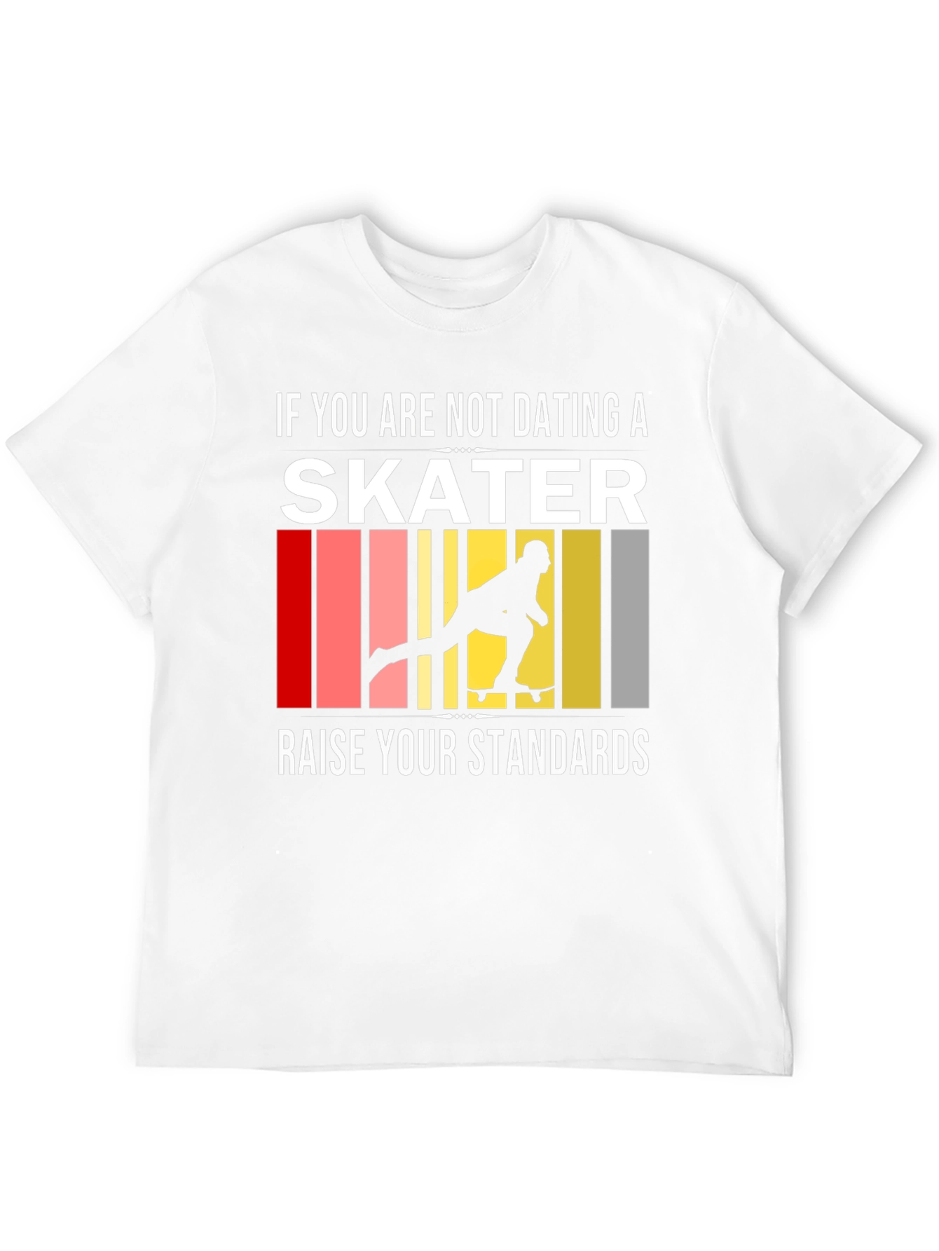 Make a statement with this bold black graphic tee! Featuring a retro-style design, the shirt playfully encourages higher standards in dating. "If You Are Not Dating A Skater, Raise Your Standards" is printed clearly above a silhouette of a skateboarder. The design incorporates vibrant stripes in red, pink, yellow, and gray, adding a pop of color. Crafted from comfortable black cotton, this tee is perfect for casual wear and expressing your unique style. Show off your personality and love for skating with this eye-catching t-shirt! Ideal for skater enthusiasts and anyone with a sense of humor. Makes a great gift!