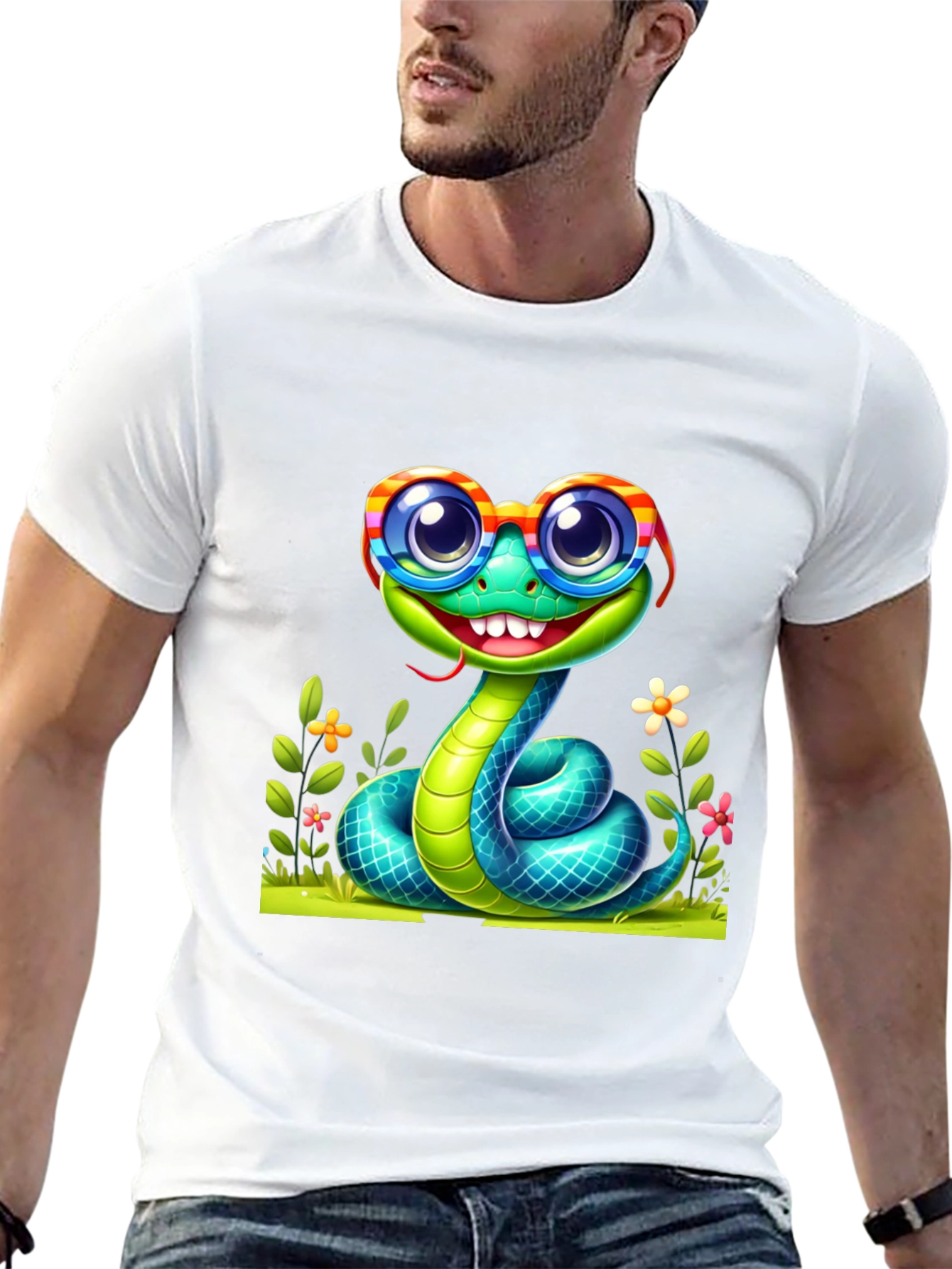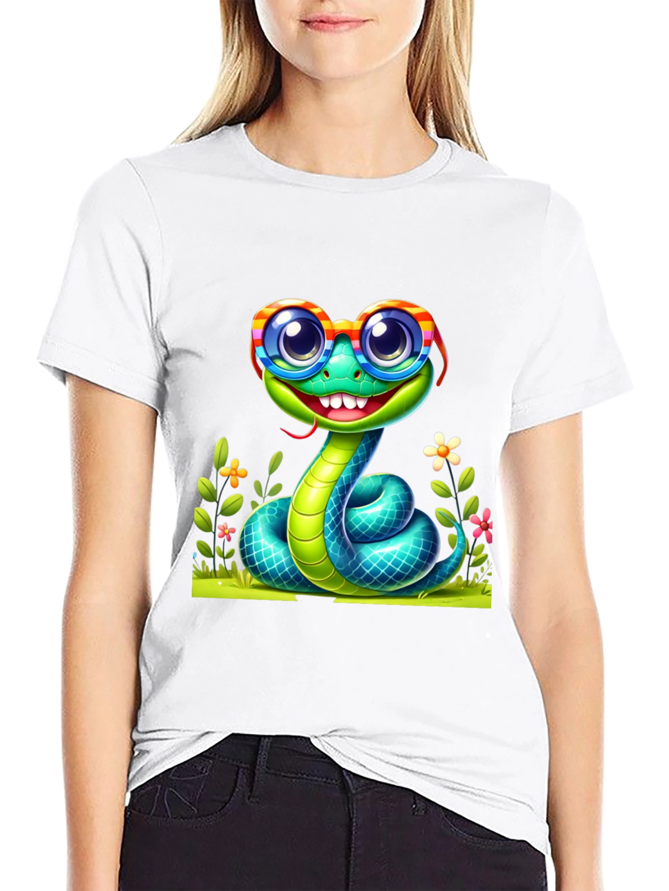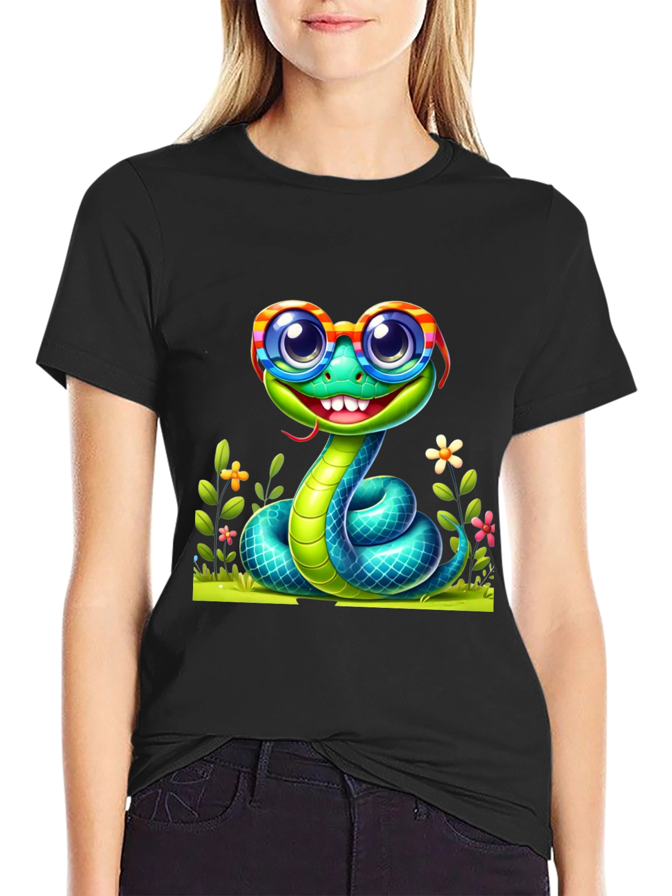 Show off your love for reptiles with this unique graphic tee! Featuring a cartoon snake wearing colorful striped glasses, this black t-shirt is sure to turn heads. The playful design includes vibrant flowers and lush green grass, adding a touch of whimsy to your wardrobe. Perfect for casual outings, reptile enthusiasts, or anyone who loves a fun and quirky look. Comfortable and eye-catching, this t-shirt is a must-have for adding personality to your everyday style. Get yours today!