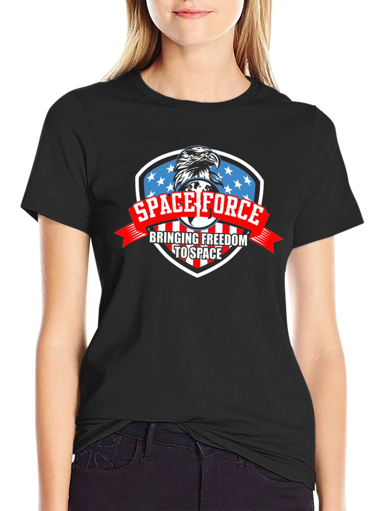 Show your support for the US Space Force with this striking black t-shirt. Featuring a bold graphic design with an eagle perched atop the earth, set against a shield with stars. The prominent 'SPACE FORCE' text is emblazoned across a red banner, with the slogan 'BRINGING FREEDOM TO SPACE' below. This shirt is a comfortable and patriotic statement piece. Perfect for casual wear, showing your military pride, or as a unique gift for space enthusiasts. Made from what appears to be soft, breathable material, it's ideal for everyday comfort. Get yours today and make a statement!