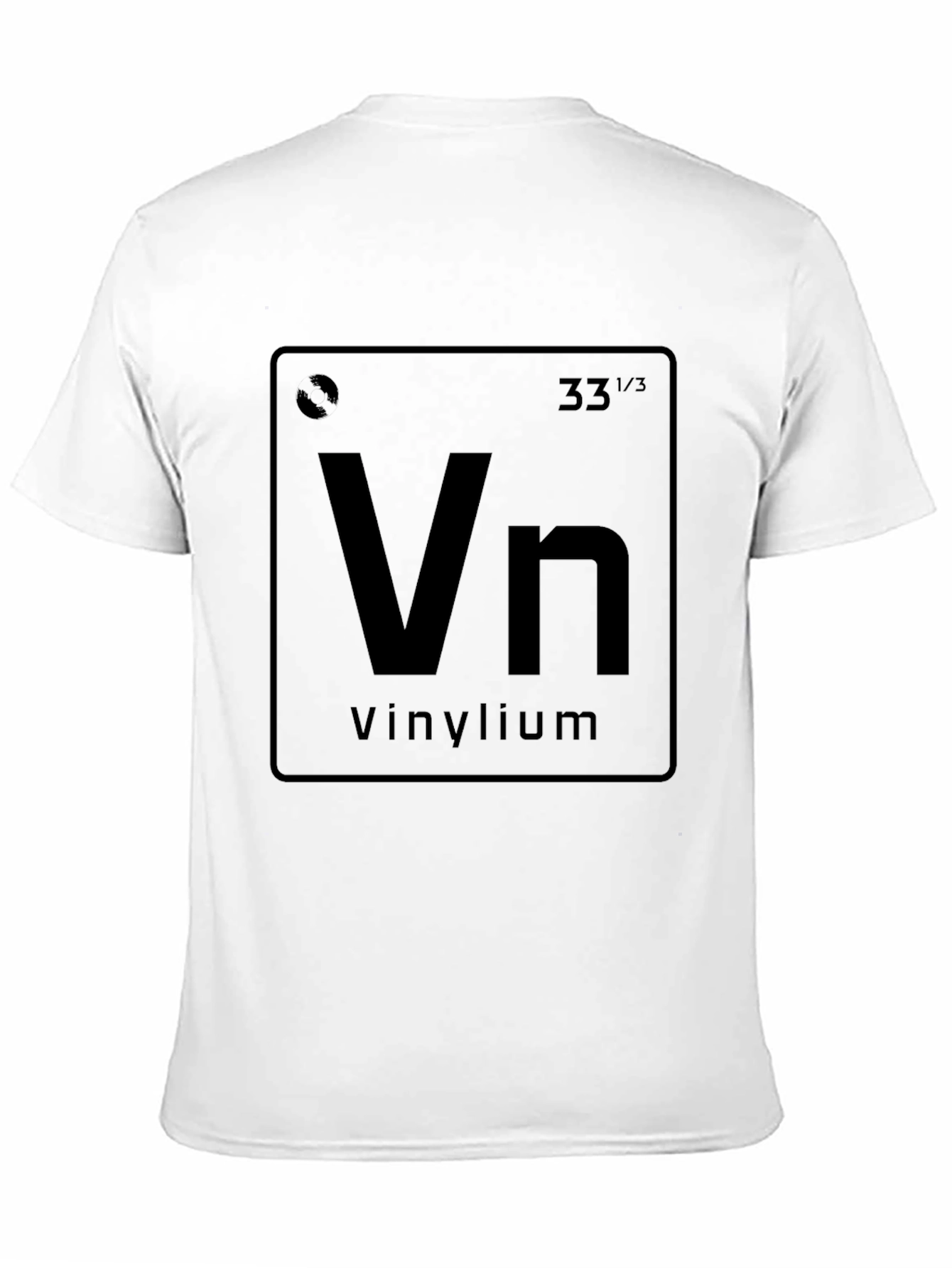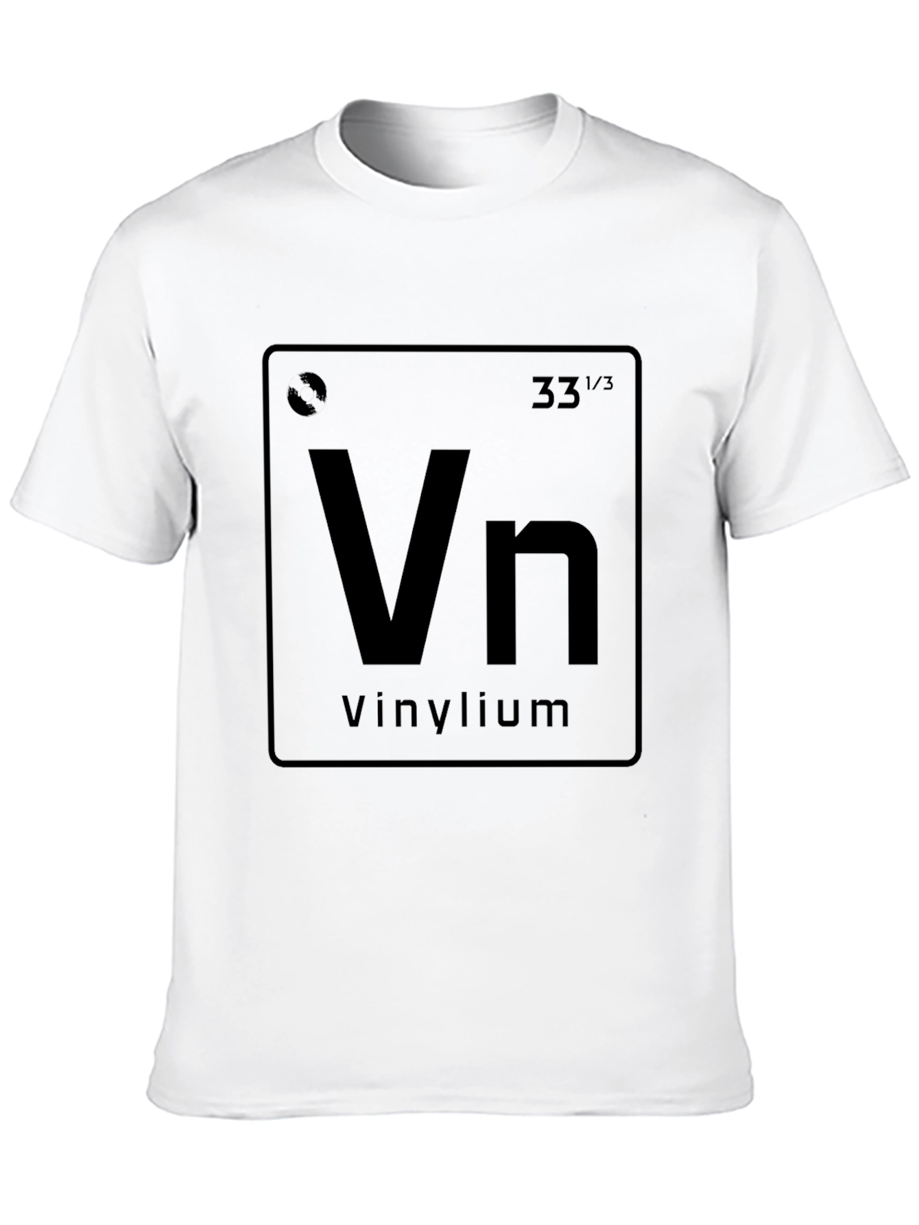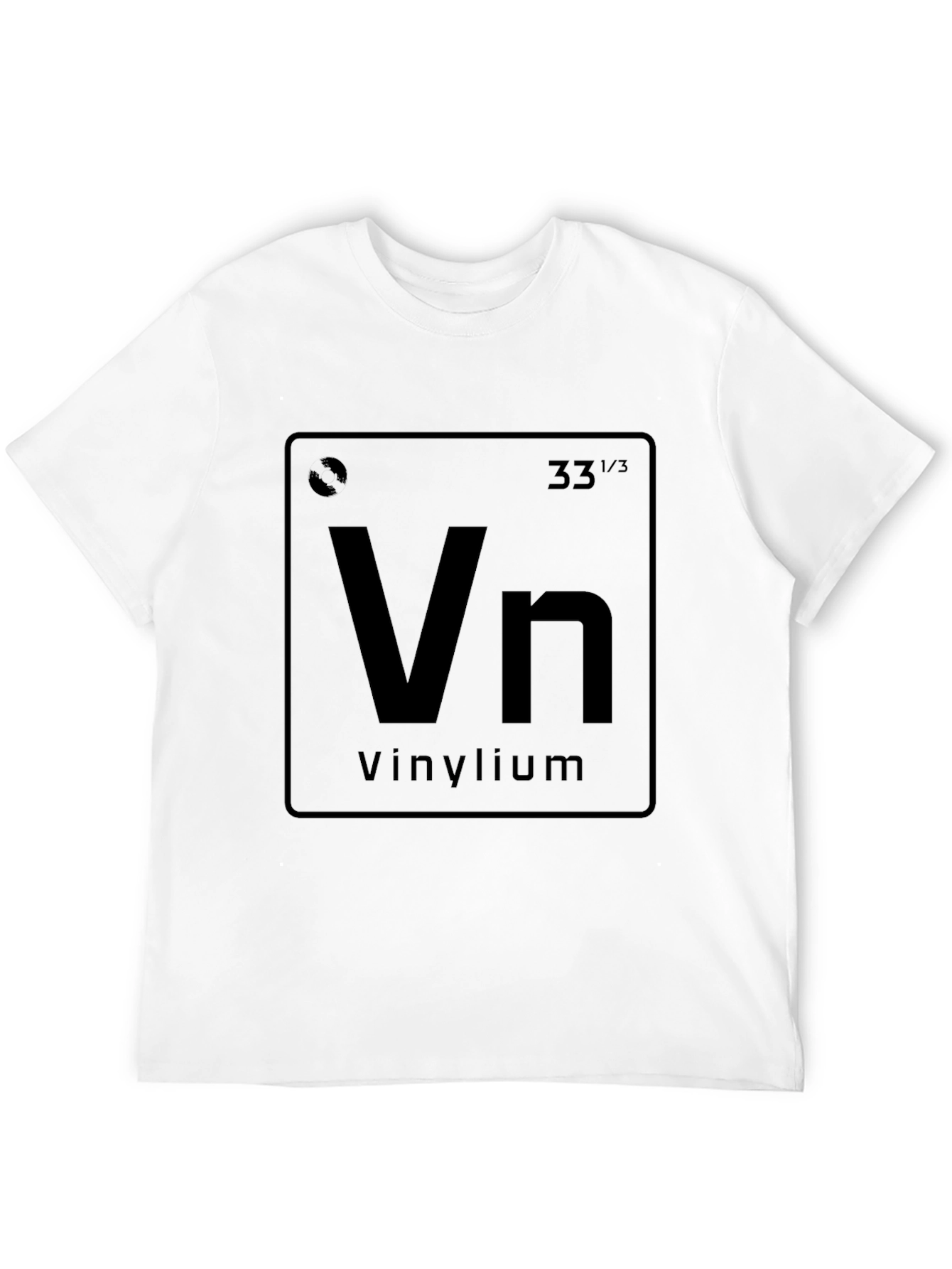 Showcase your love for vinyl records with this unique t-shirt. Featuring a creative design inspired by the periodic table, the tee displays 'Vn' for Vinylium. This t-shirt is an excellent conversation starter and a must-have for music lovers, audiophiles, and vinyl collectors. The dark color enhances the print, making it eye-catching and stylish. Made from comfortable fabric, this t-shirt is perfect for casual wear, music events, record store visits, or just relaxing at home. A fun and geeky addition to any wardrobe!