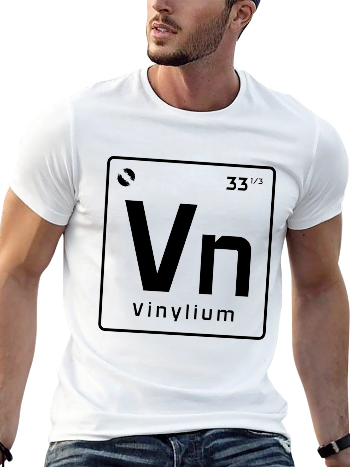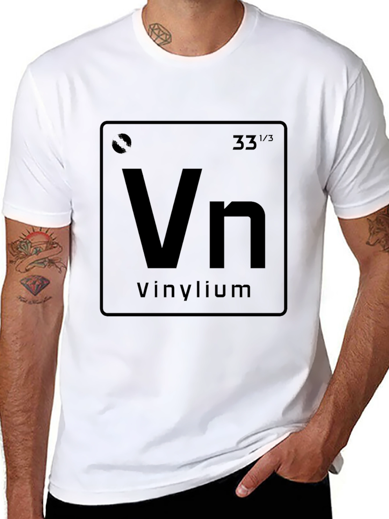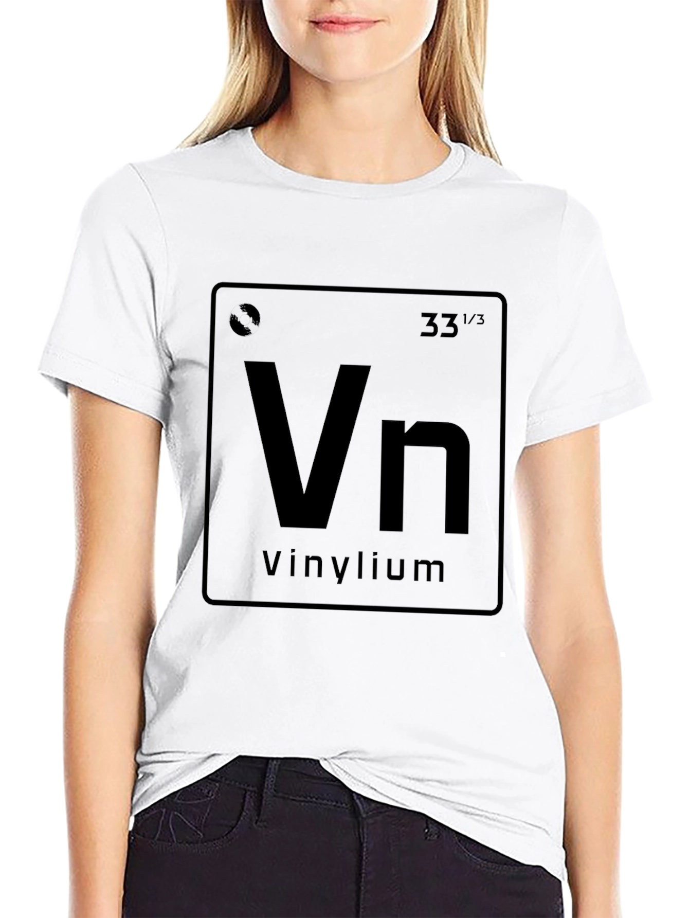 Showcase your love for vinyl records with this unique t-shirt. Featuring a creative design inspired by the periodic table, the tee displays 'Vn' for Vinylium. This t-shirt is an excellent conversation starter and a must-have for music lovers, audiophiles, and vinyl collectors. The dark color enhances the print, making it eye-catching and stylish. Made from comfortable fabric, this t-shirt is perfect for casual wear, music events, record store visits, or just relaxing at home. A fun and geeky addition to any wardrobe!