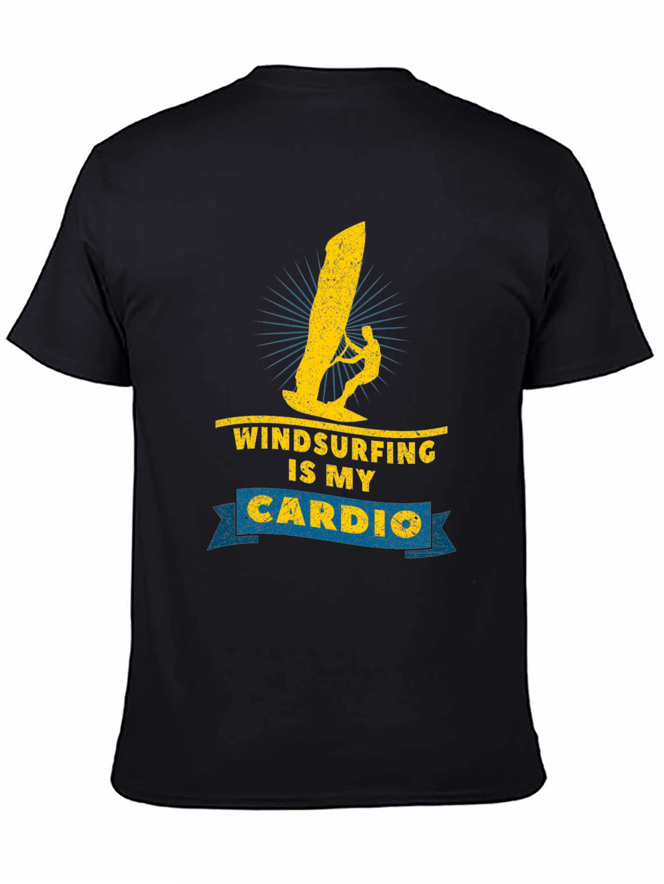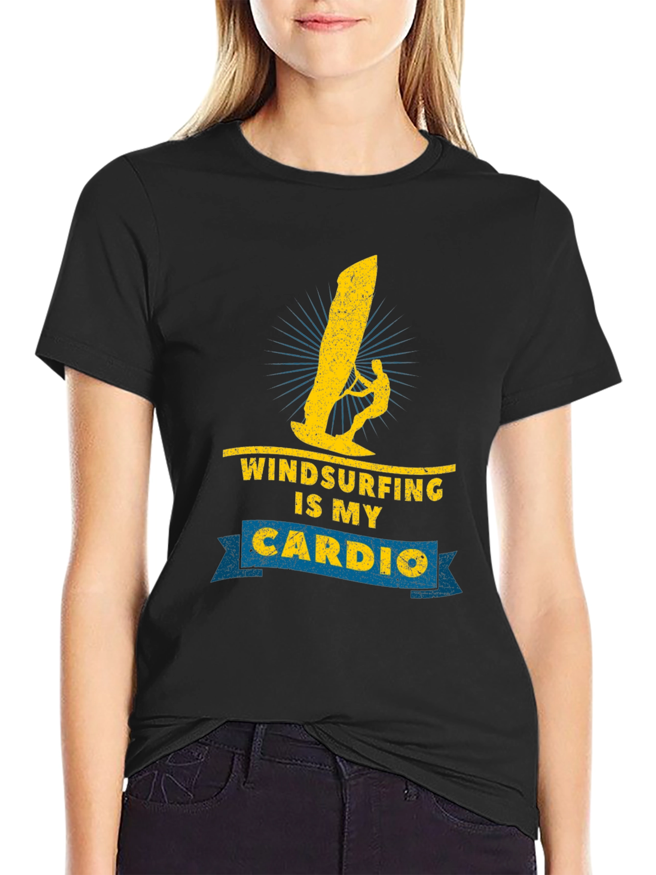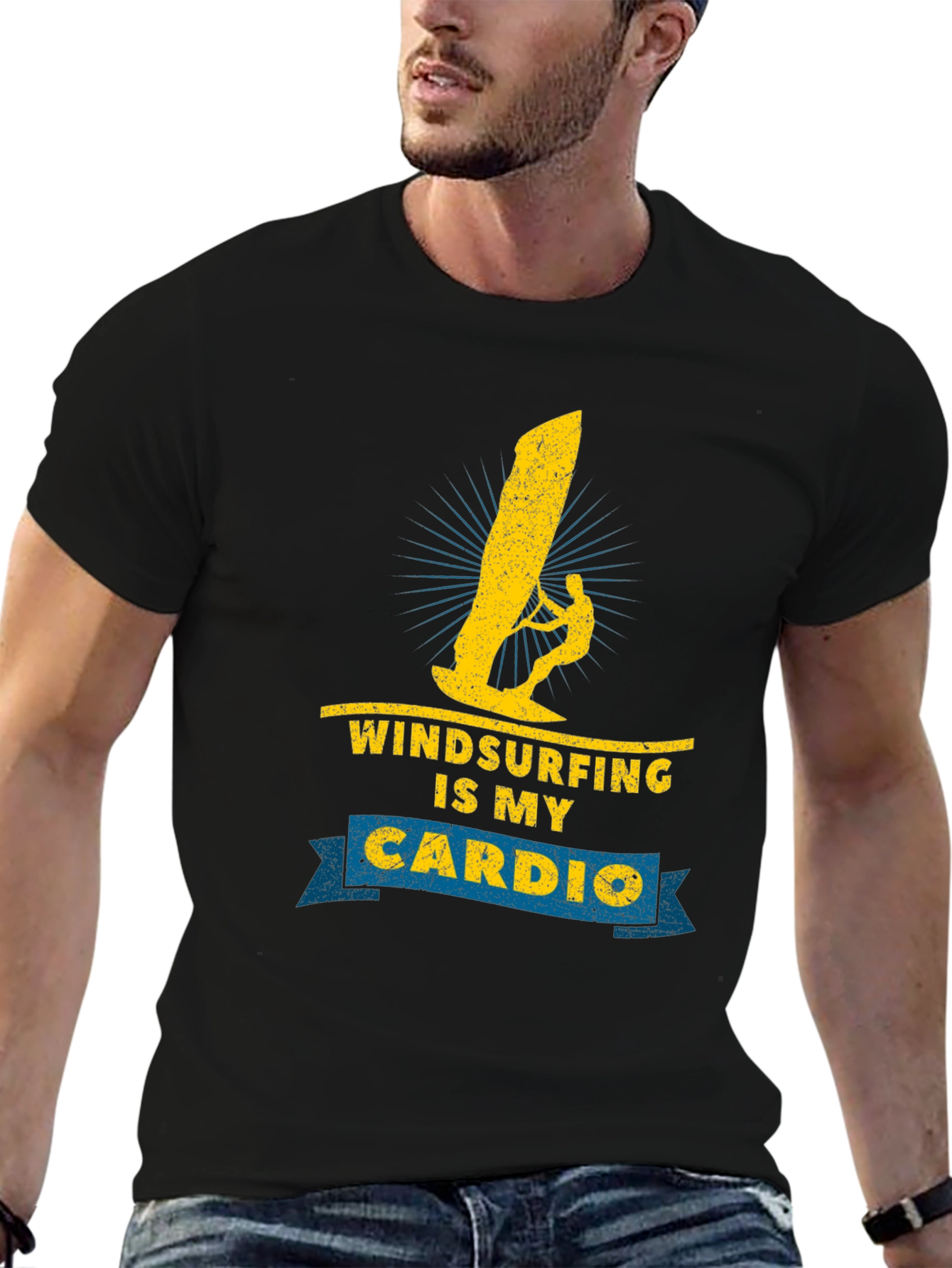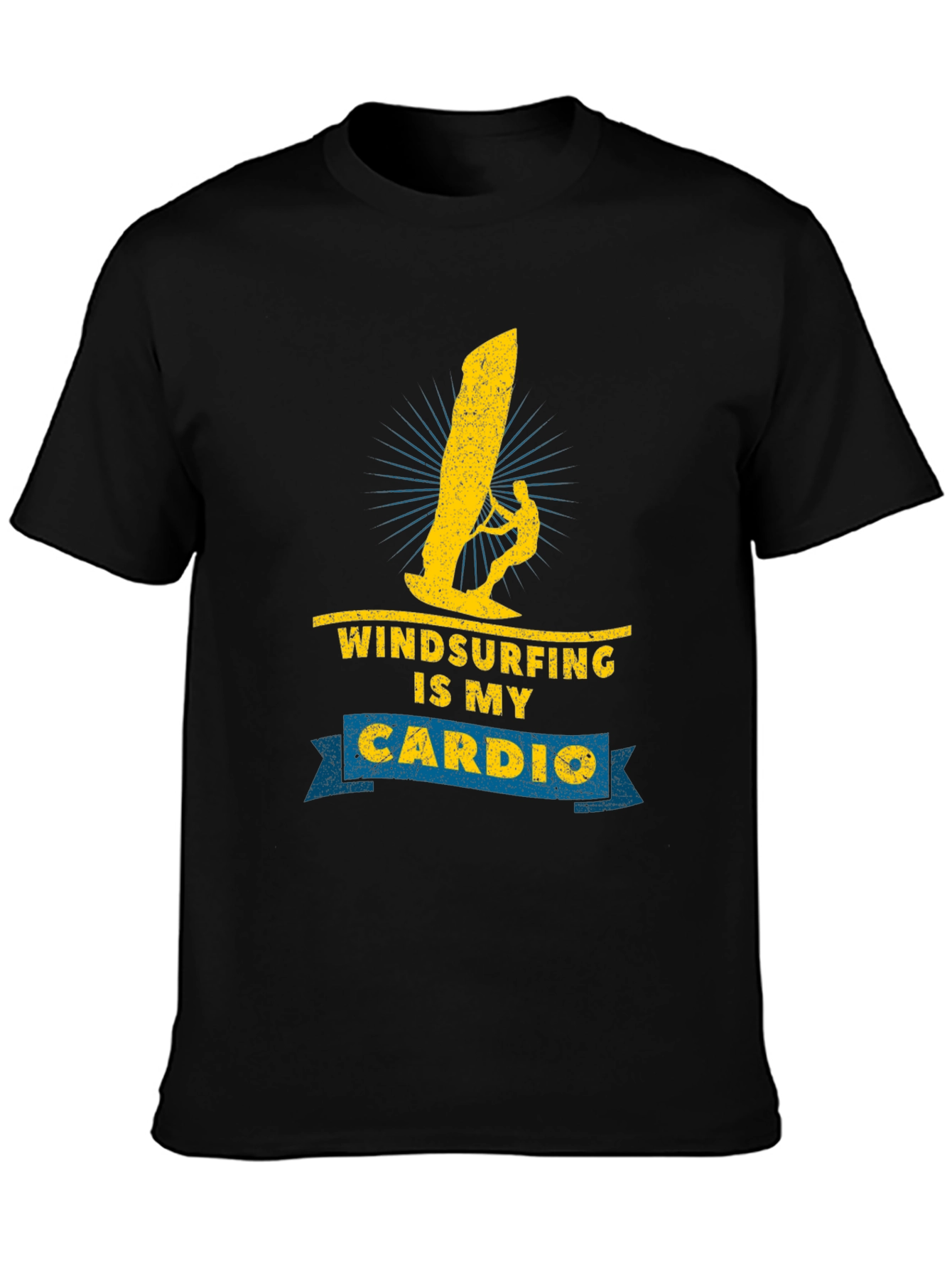 Showcase your love for windsurfing with this stylish black t-shirt. The design features a vibrant yellow graphic of a windsurfer catching a wave, complemented by the humorous phrase "Windsurfing is My Cardio" in matching yellow text accented with blue. Made from what appears to be a comfortable material, this short-sleeve tee offers a relaxed fit, perfect for casual wear. Whether you're an avid windsurfer or simply enjoy the sport's vibe, this t-shirt is a fun way to express your interests. It's ideal for beach days, casual outings, or as a unique gift for the windsurfing enthusiast in your life.