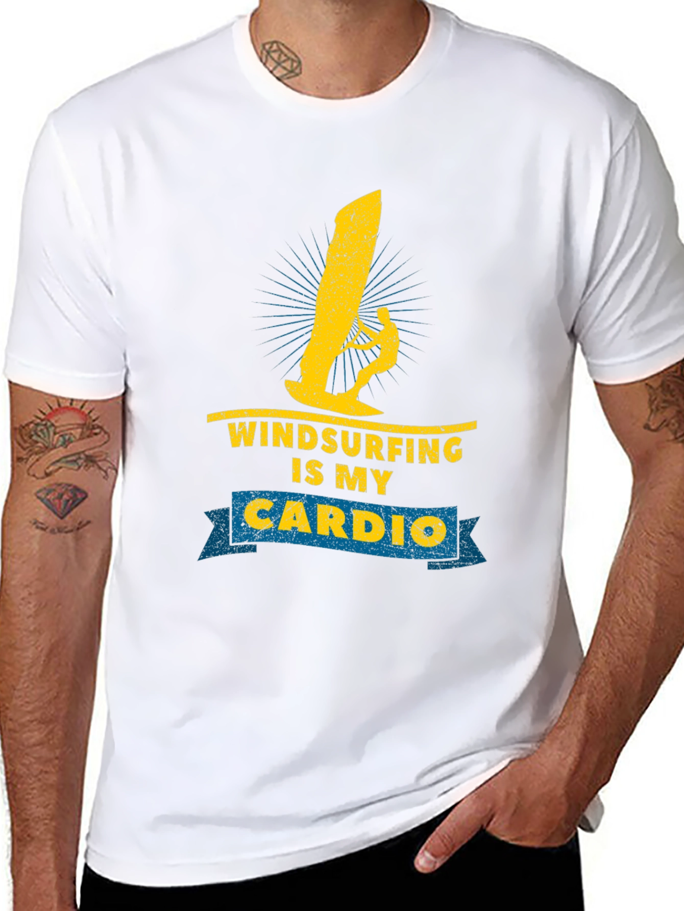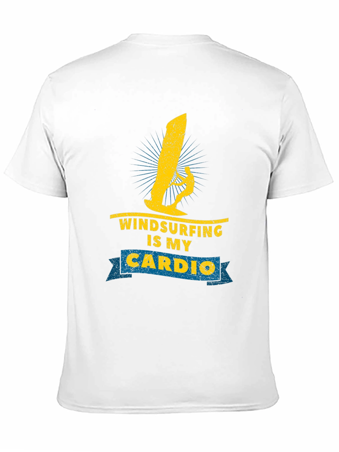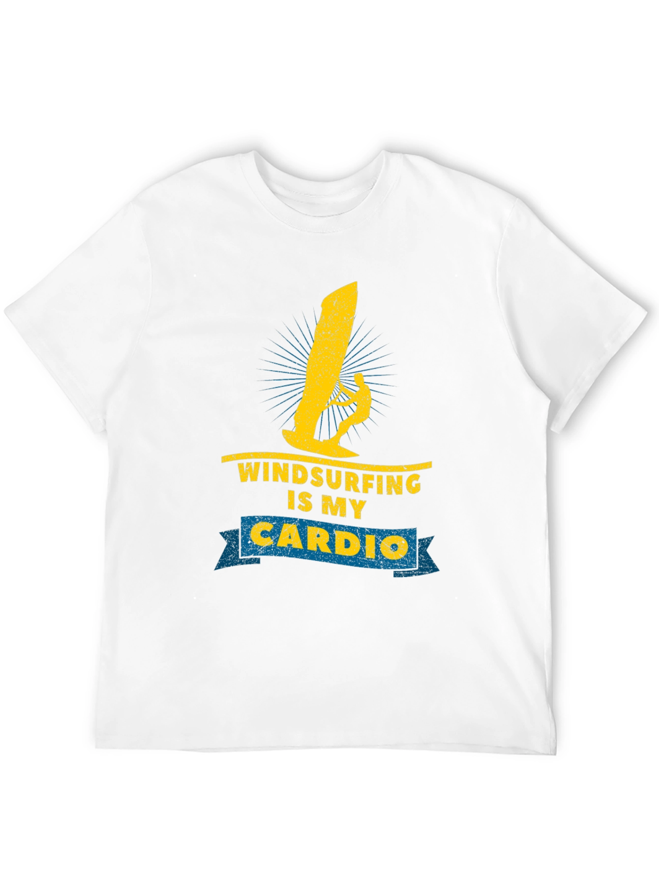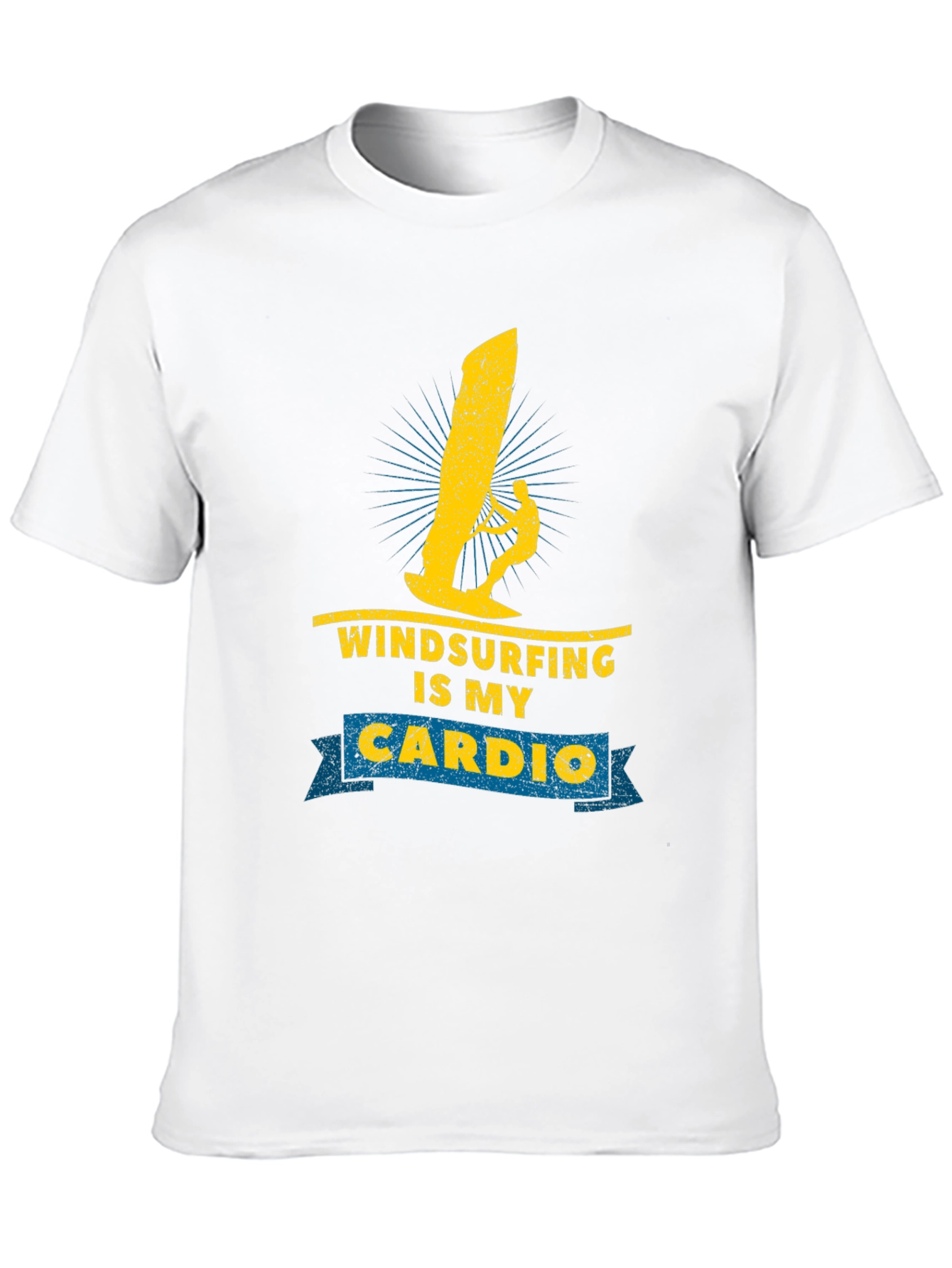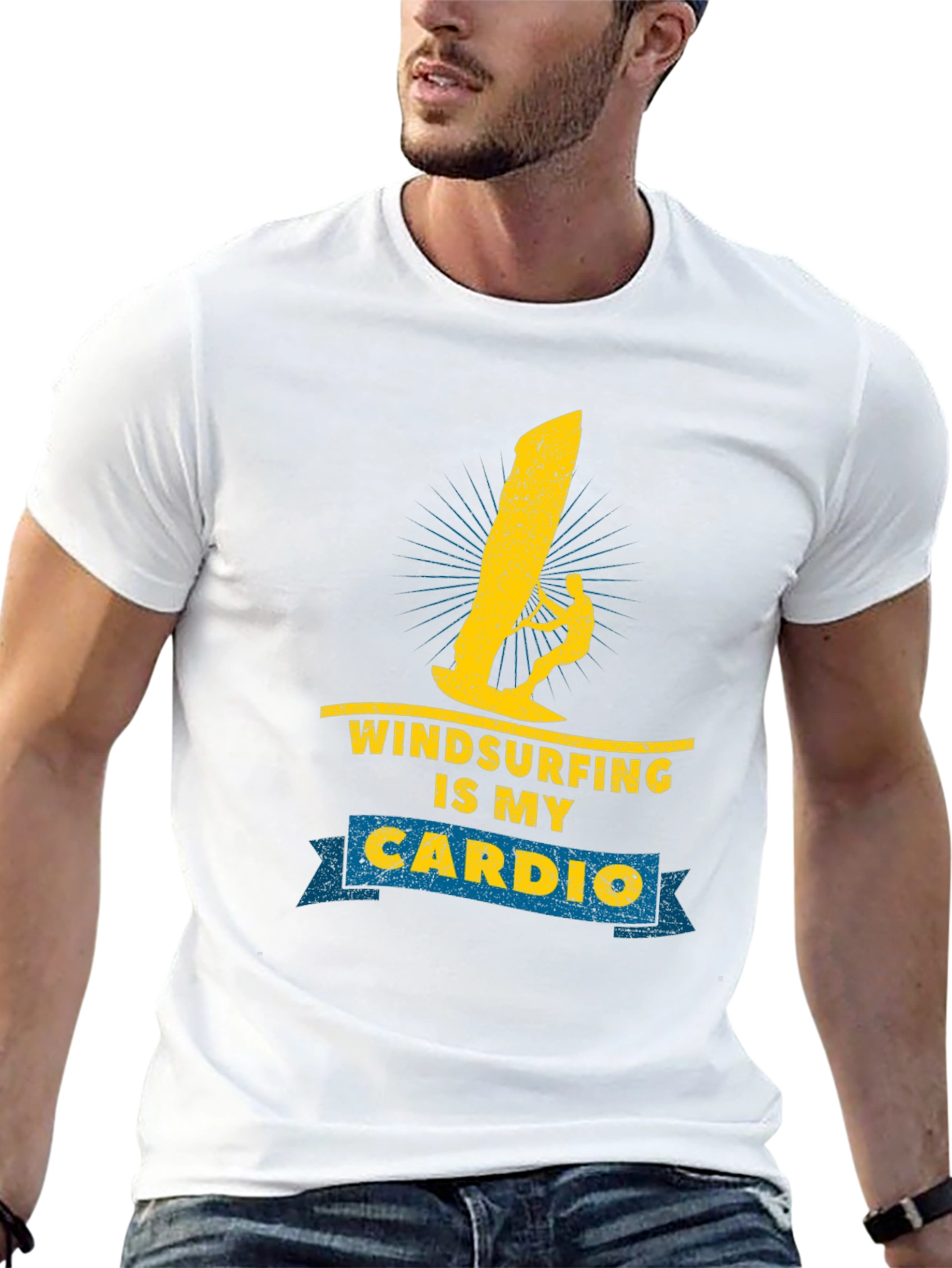 Showcase your love for windsurfing with this stylish black t-shirt. The design features a vibrant yellow graphic of a windsurfer catching a wave, complemented by the humorous phrase "Windsurfing is My Cardio" in matching yellow text accented with blue. Made from what appears to be a comfortable material, this short-sleeve tee offers a relaxed fit, perfect for casual wear. Whether you're an avid windsurfer or simply enjoy the sport's vibe, this t-shirt is a fun way to express your interests. It's ideal for beach days, casual outings, or as a unique gift for the windsurfing enthusiast in your life.